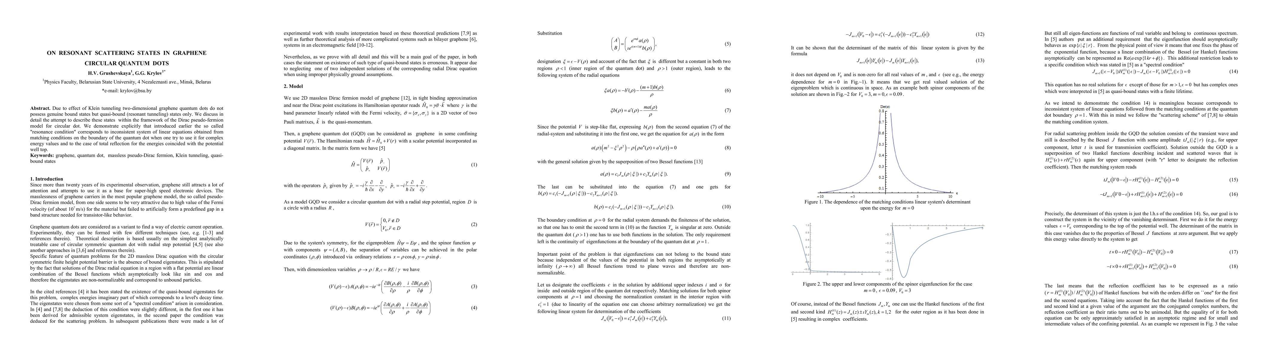 Summary: This paper explores resonant tunneling states in graphene circular quantum dots, finding that Klein tunneling precludes genuine bound states, only allowing quasi-bound states. It critiques the use of the Dirac pseudo-fermion model for describing these states, highlighting the inconsistency when applying the "resonance condition" to complex energy values.