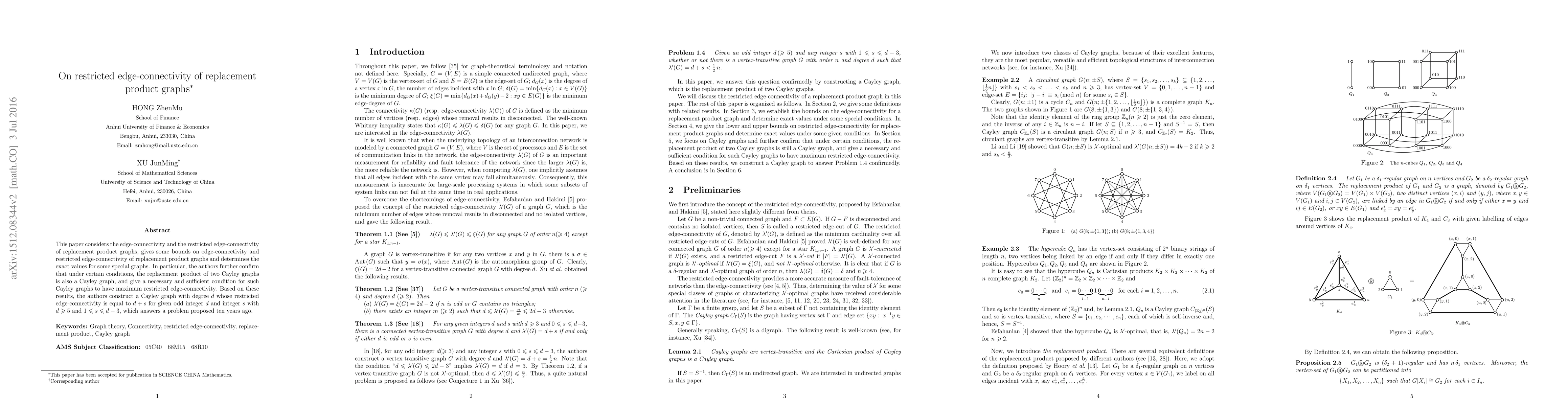 This paper explores the edge-connectivity and restricted edge-connectivity of replacement product graphs, providing bounds and exact values for special cases. It establishes conditions for the replacement product of Cayley graphs to remain a Cayley graph and constructs a Cayley graph with specified restricted edge-connectivity.