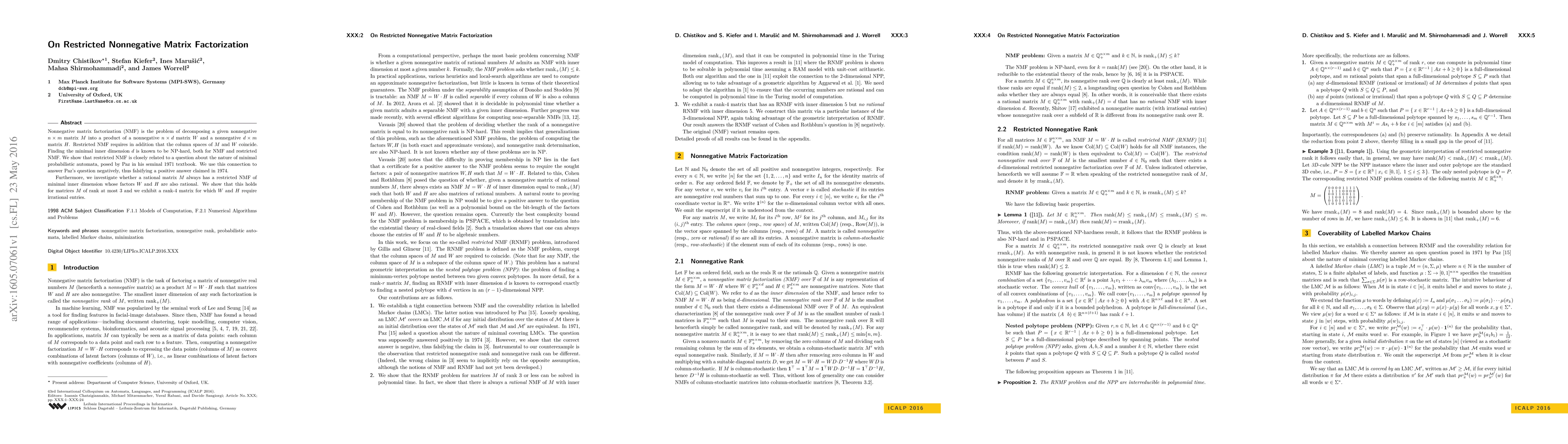Nonnegative matrix factorization (NMF) is the problem of decomposing a given nonnegative $n \times m$ matrix $M$ into a product of a nonnegative $n \times d$ matrix $W$ and a nonnegative $d \times m$ matrix $H$. Restricted NMF requires in addition that the column spaces of $M$ and $W$ coincide. Finding the minimal inner dimension $d$ is known to be NP-hard, both for NMF and restricted NMF. We show that restricted NMF is closely related to a question about the nature of minimal probabilistic automata, posed by Paz in his seminal 1971 textbook. We use this connection to answer Paz's question negatively, thus falsifying a positive answer claimed in 1974. Furthermore, we investigate whether a rational matrix $M$ always has a restricted NMF of minimal inner dimension whose factors $W$ and $H$ are also rational. We show that this holds for matrices $M$ of rank at most $3$ and we exhibit a rank-$4$ matrix for which $W$ and $H$ require irrational entries.