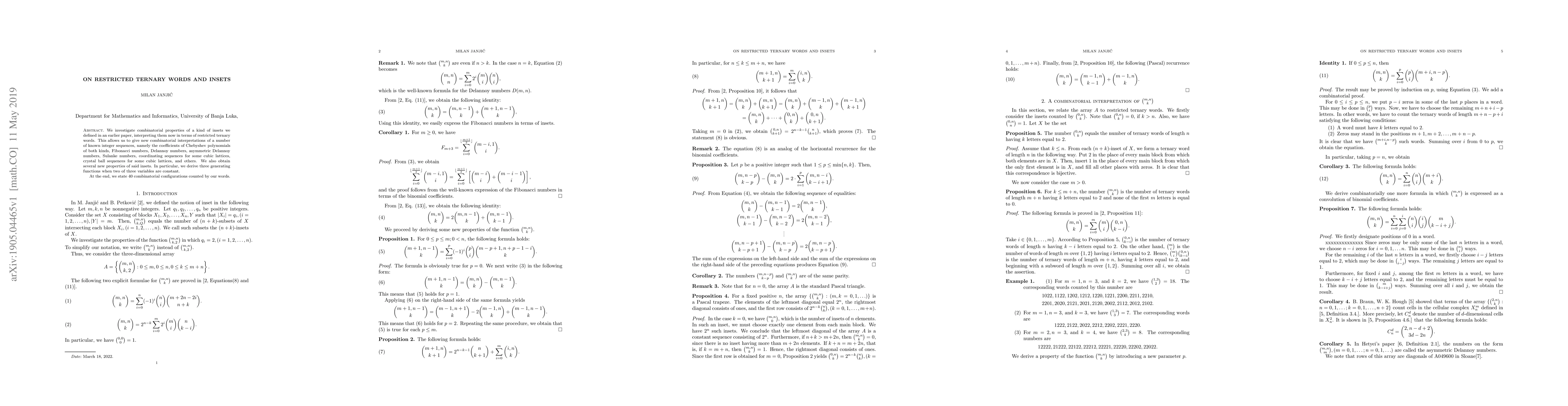 We investigate combinatorial properties of a kind of insets we defined in an earlier paper, interpreting them now in terms of restricted ternary words. This allows us to give new combinatorial interpretations of a number of known integer sequences, namely the coefficients of Chebyshev polynomials of both kinds, Fibonacci numbers, Delannoy numbers, asymmetric Delannoy numbers, Sulanke numbers, coordinating sequences for some cubic lattices, crystal ball sequences for some cubic lattices, and others. We also obtain several new properties of said insets. In particular, we derive three generating functions when two of three variables are constant. At the end, we state 40 combinatorial configurations counted by our words.