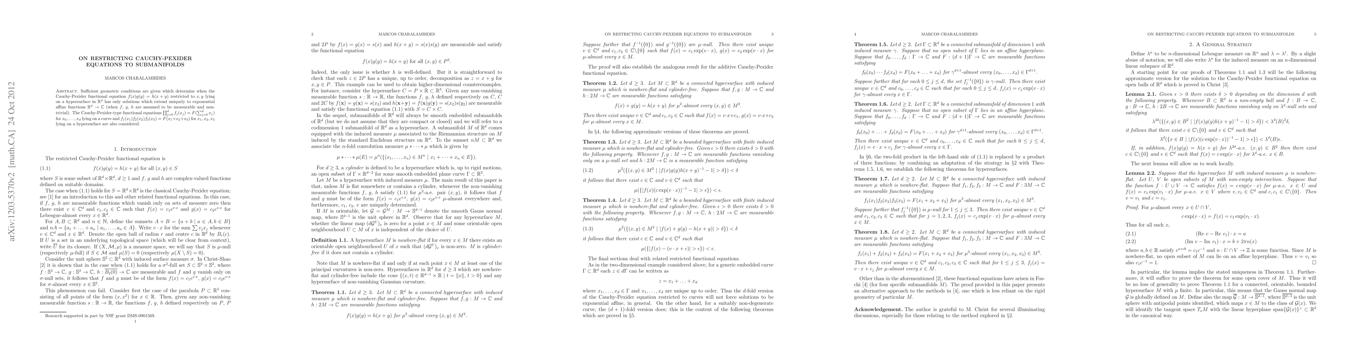 This paper provides geometric conditions for the Cauchy-Pexider functional equation to have unique solutions extending to exponential affine functions when restricted to hypersurfaces in R^d. It also examines related functional equations in this context.