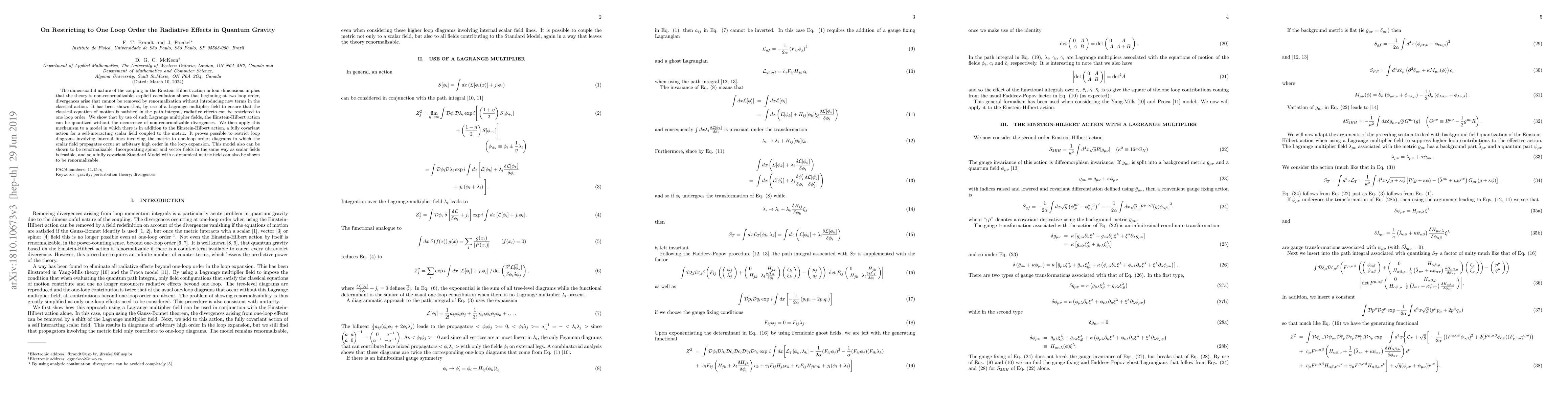 The dimensionful nature of the coupling in the Einstein-Hilbert action in four dimensions implies that the theory is non-renormalizable; explicit calculation shows that beginning at two loop order, divergences arise that cannot be removed by renormalization without introducing new terms in the classical action. It has been shown that, by use of a Lagrange multiplier field to ensure that the classical equation of motion is satisfied in the path integral, radiative effects can be restricted to one loop order. We show that by use of such Lagrange multiplier fields, the Einstein-Hilbert action can be quantized without the occurrence of non-renormalizable divergences. We then apply this mechanism to a model in which there is in addition to the Einstein-Hilbert action, a fully covariant action for a self-interacting scalar field coupled to the metric. It proves possible to restrict loop diagrams involving internal lines involving the metric to one-loop order; diagrams in which the scalar field propagates occur at arbitrary high order in the loop expansion. This model also can be shown to be renormalizable. Incorporating spinor and vector fields in the same way as scalar fields is feasible, and so a fully covariant Standard Model with a dynamical metric field can also be shown to be renormalizable