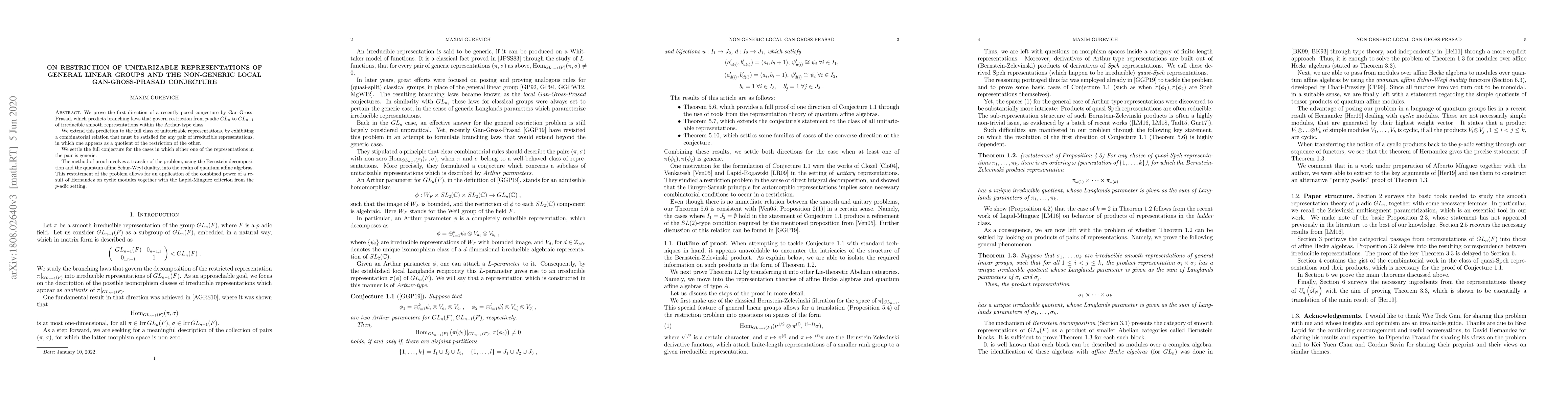 We prove one direction of a recently posed conjecture by Gan-Gross-Prasad, which predicts the branching laws that govern restriction from p-adic $GL_n$ to $GL_{n-1}$ of irreducible smooth representations within the Arthur-type class. We extend this prediction to the full class of unitarizable representations, by exhibiting a combinatorial relation that must be satisfied for any pair of irreducible representations, in which one appears as a quotient of the restriction of the other. We settle the full conjecture for the cases in which either one of the representations in the pair is generic. The method of proof involves a transfer of the problem, using the Bernstein decomposition and the quantum affine Schur-Weyl duality, into the realm of quantum affine algebras. This restatement of the problem allows for an application of the combined power of a result of Hernandez on cyclic modules together with the Lapid-Minguez criterion from the p-adic setting.
