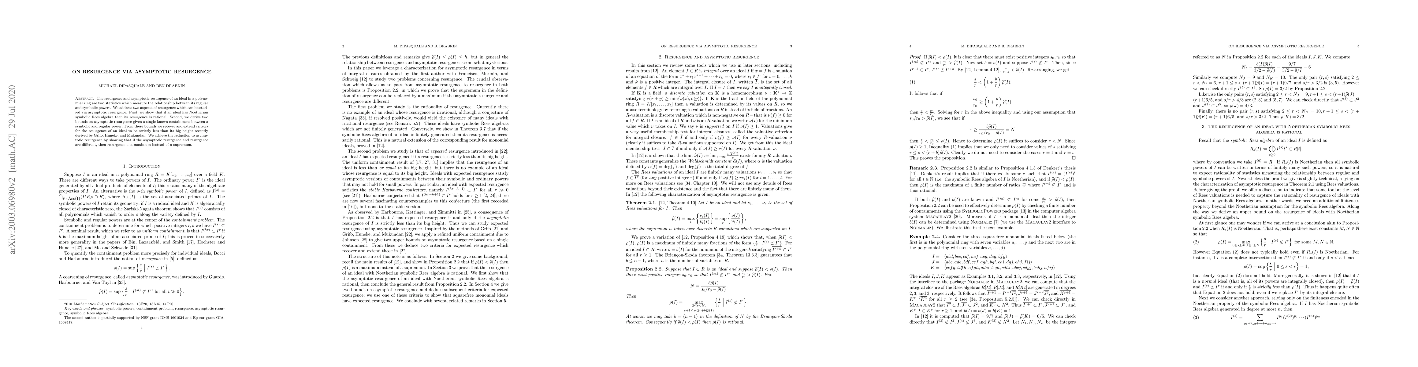 The resurgence and asymptotic resurgence of an ideal in a polynomial ring are two statistics which measure the relationship between its regular and symbolic powers. We address two aspects of resurgence which can be studied via asymptotic resurgence. First, we show that if an ideal has Noetherian symbolic Rees algebra then its resurgence is rational. Second, we derive two bounds on asymptotic resurgence given a single known containment between a symbolic and regular power. From these bounds we recover and extend criteria for the resurgence of an ideal to be strictly less than its big height recently derived by Grifo, Huneke, and Mukundan. We achieve the reduction to asymptotic resurgence by showing that if the asymptotic resurgence and resurgence are different, then resurgence is a maximum instead of a supremum.