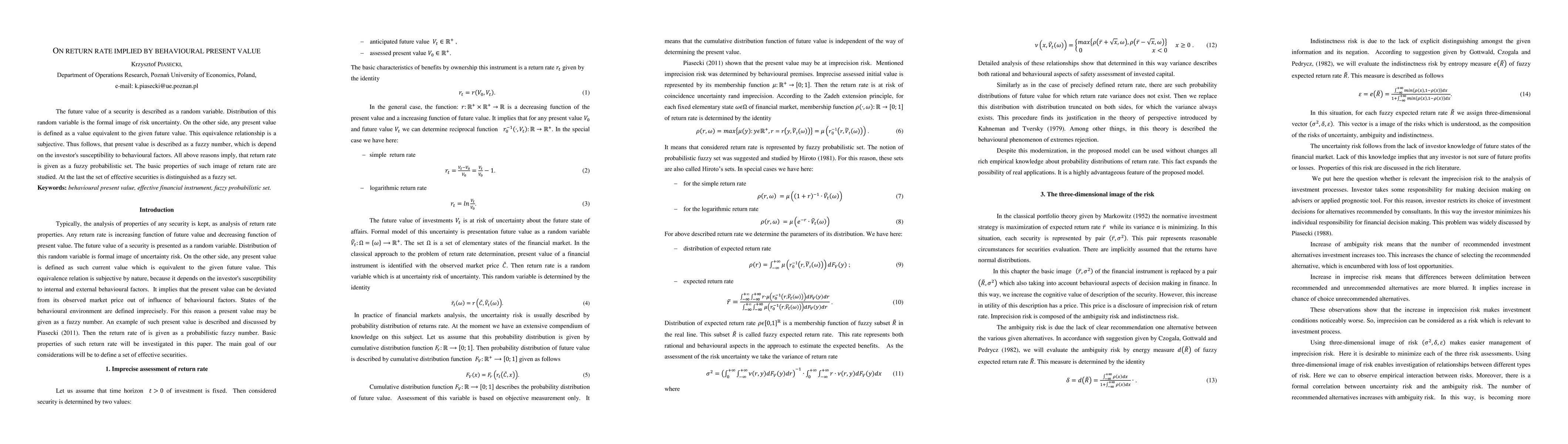 The future value of a security is described as a random variable. Distribution of this random variable is the formal image of risk uncertainty. On the other side, any present value is defined as a value equivalent to the given future value. This equivalence relationship is a subjective. Thus follows, that present value is described as a fuzzy number, which is depend on the investor's susceptibility to behavioural factors. All above reasons imply, that return rate is given as a fuzzy probabilistic set. The basic properties of such image of return rate are studied. At the last the set of effective securities is distinguished as a fuzzy set.