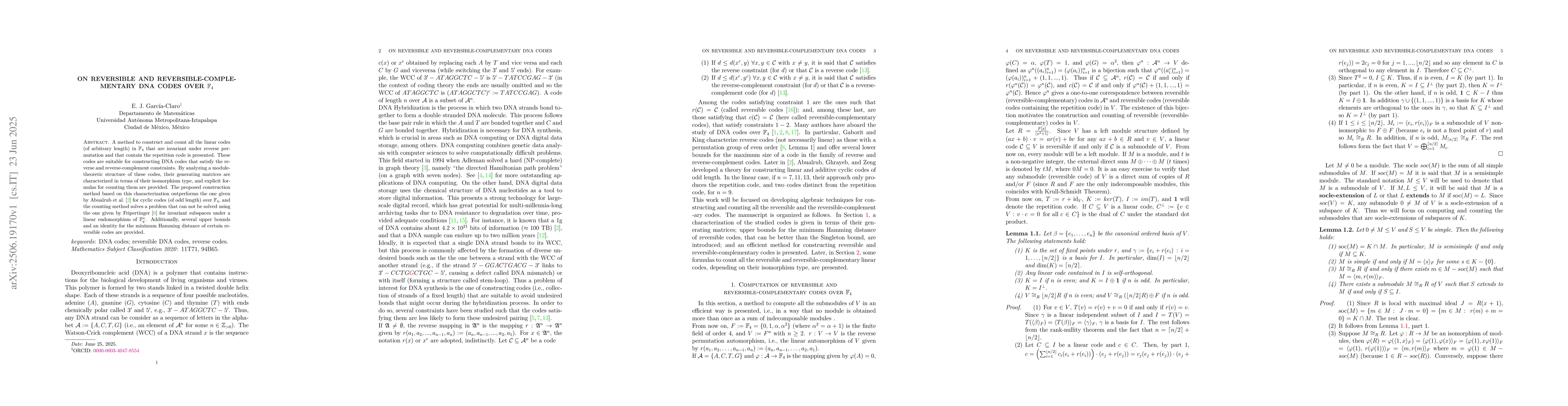 A method to construct and count all the linear codes (of arbitrary length) in $\mathbb{F}_{4}$ that are invariant under reverse permutation and that contain the repetition code is presented. These codes are suitable for constructing DNA codes that satisfy the reverse and reverse-complement constraints. By analyzing a module-theoretic structure of these codes, their generating matrices are characterized in terms of their isomorphism type, and explicit formulas for counting them are provided. The proposed construction method based on this characterization outperforms the one given by Abualrub et al. for cyclic codes (of odd length) over $\mathbb{F}_{4}$, and the counting method solves a problem that can not be solved using the one given by Fripertinger for invariant subspaces under a linear endomorphism of $\mathbb{F}_{q}^{n}$. Additionally, several upper bounds and an identity for the minimum Hamming distance of certain reversible codes are provided.