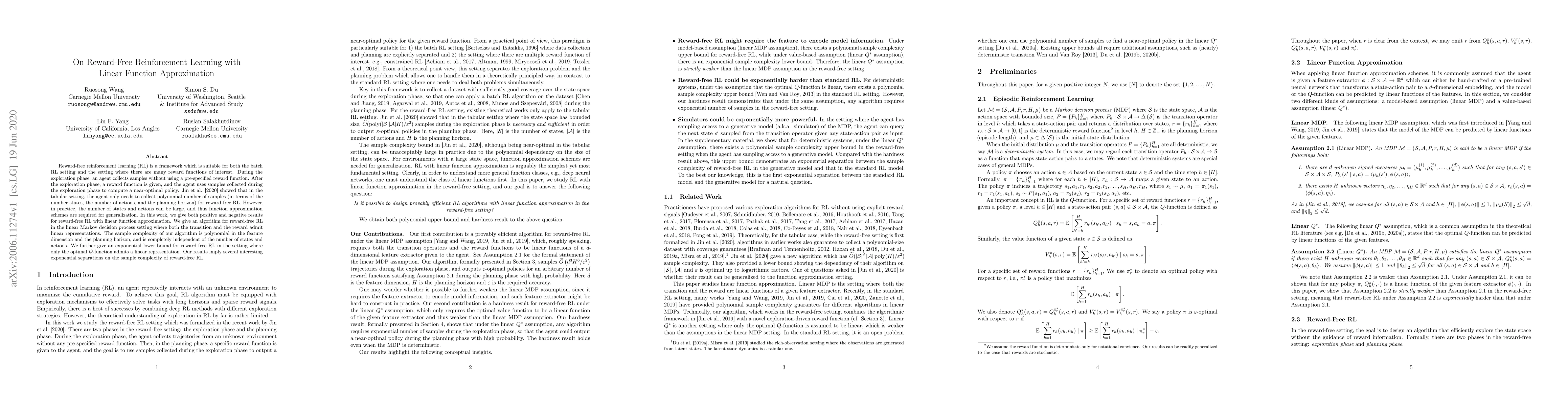 This paper explores reward-free reinforcement learning (RL) using linear function approximation, presenting both an algorithm and a lower bound for sample complexity. The proposed algorithm achieves polynomial sample complexity independent of the number of states and actions, while the lower bound shows exponential separations in certain settings.