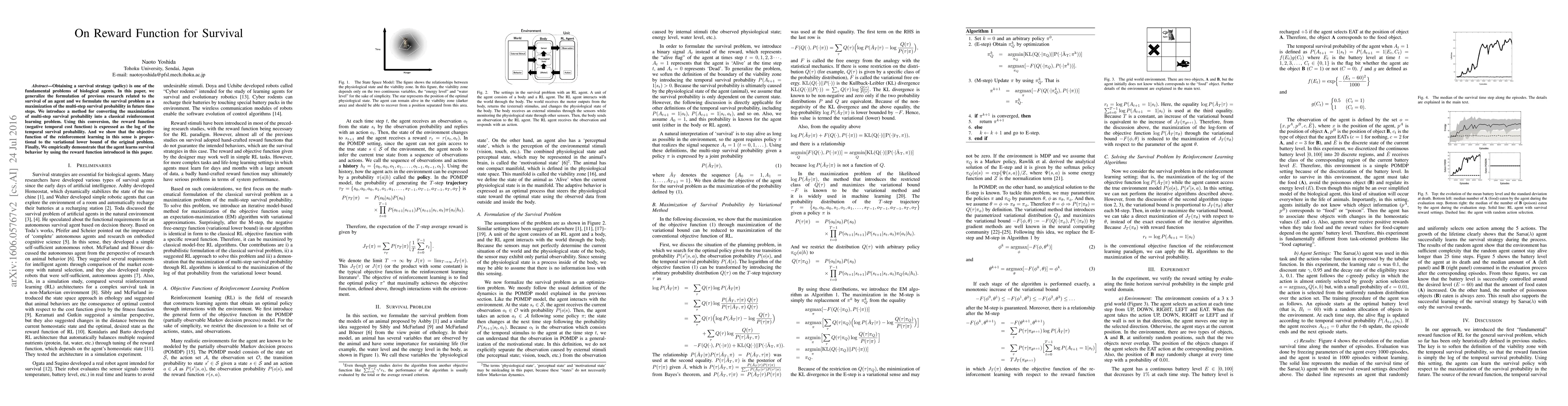 Obtaining a survival strategy (policy) is one of the fundamental problems of biological agents. In this paper, we generalize the formulation of previous research related to the survival of an agent and we formulate the survival problem as a maximization of the multi-step survival probability in future time steps. We introduce a method for converting the maximization of multi-step survival probability into a classical reinforcement learning problem. Using this conversion, the reward function (negative temporal cost function) is expressed as the log of the temporal survival probability. And we show that the objective function of the reinforcement learning in this sense is proportional to the variational lower bound of the original problem. Finally, We empirically demonstrate that the agent learns survival behavior by using the reward function introduced in this paper.