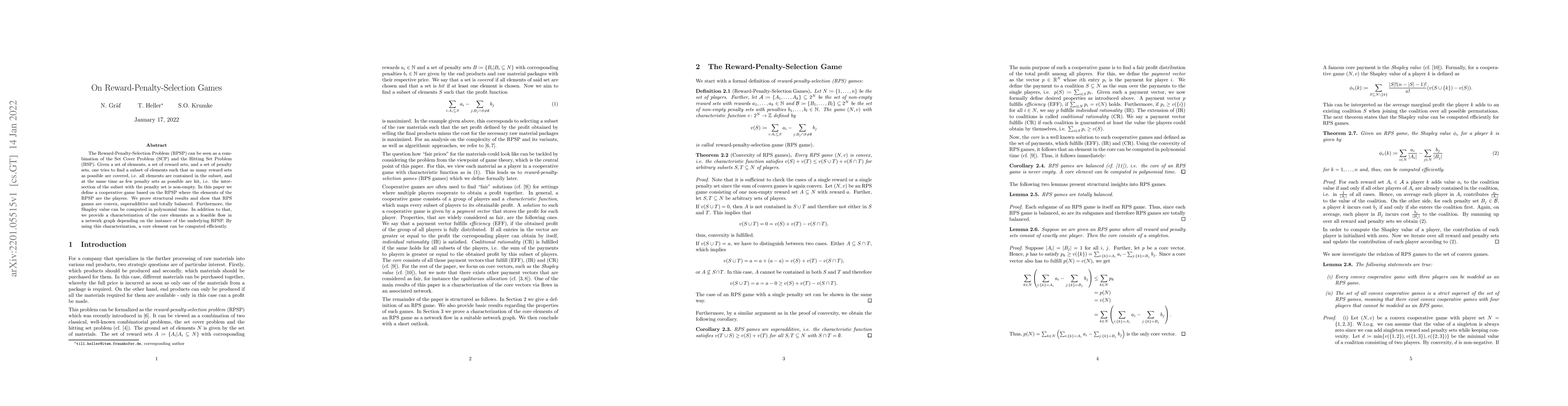This paper defines a cooperative game based on the Reward-Penalty-Selection Problem (RPSP), proving that RPS games are convex, superadditive, and totally balanced. The Shapley value can be computed in polynomial time, and the core elements are characterized as feasible flows in a network graph.