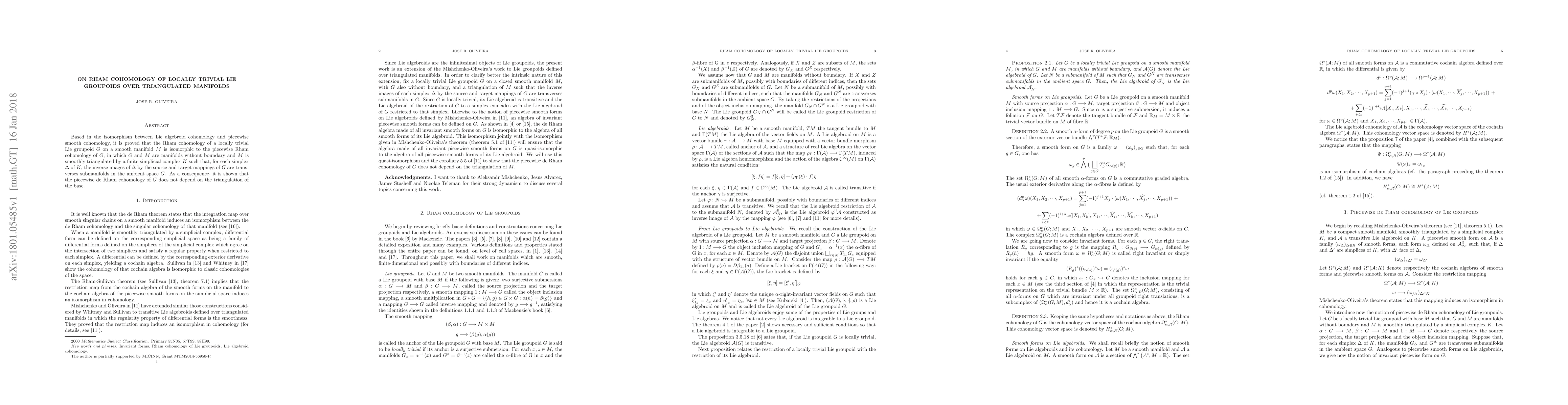 This paper establishes an isomorphism between the Rham cohomology of a locally trivial Lie groupoid and its piecewise smooth cohomology, proving that the Rham cohomology is independent of the chosen triangulation of the base manifold. The result leverages the relationship between Lie algebroid cohomology and piecewise smooth cohomology.