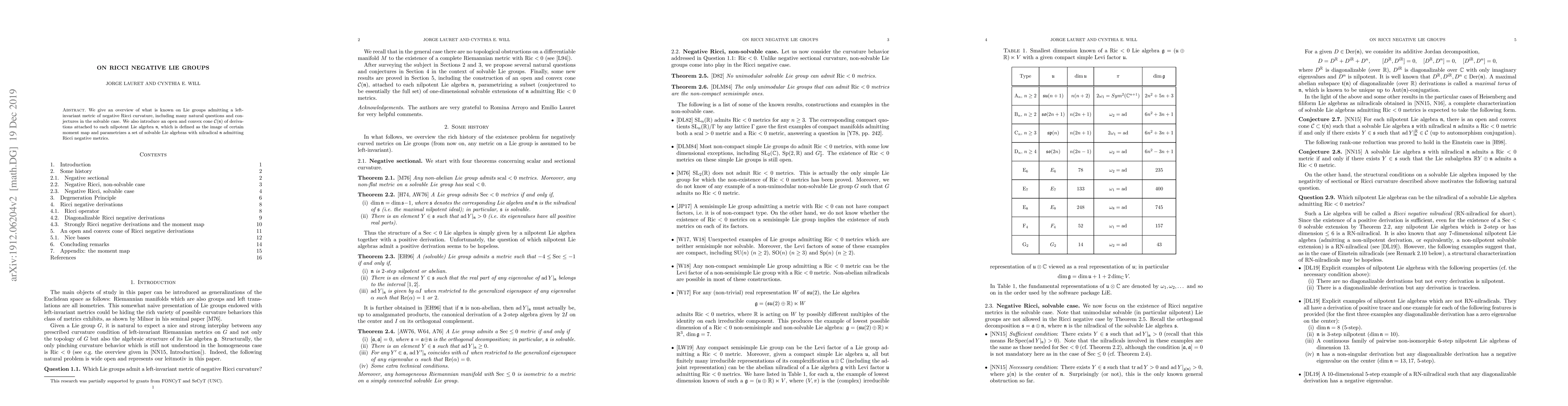 Researchers explore Lie groups with negative Ricci curvature, introducing a method to identify solvable Lie algebras with specific properties, and propose an open set of possible solutions for these cases.