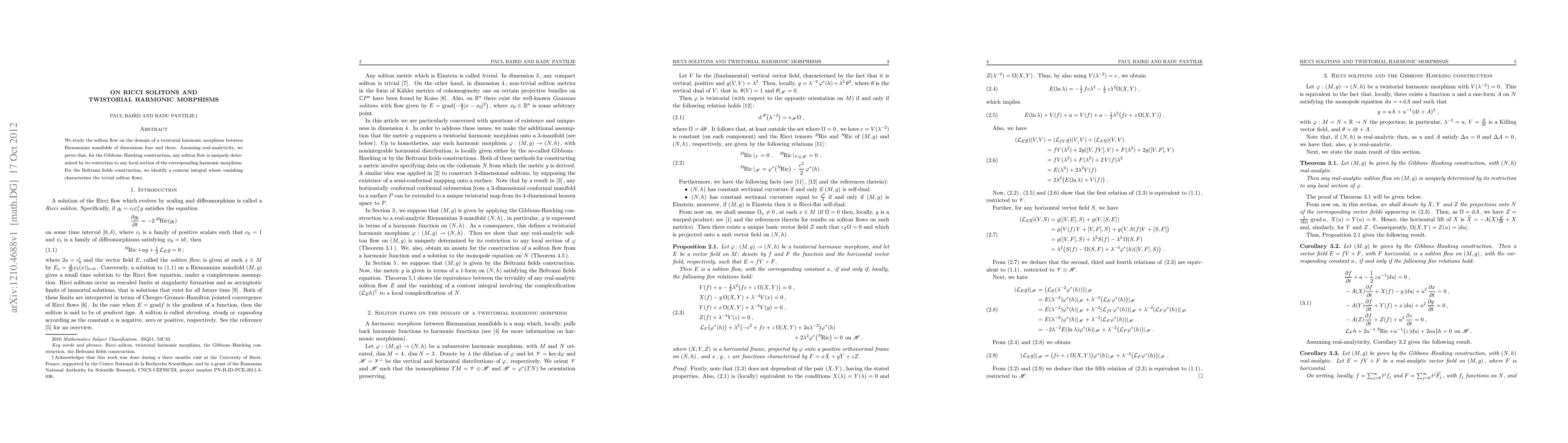 This paper investigates soliton flows on twistorial harmonic morphisms between four-dimensional and three-dimensional Riemannian manifolds, proving that the Gibbons-Hawking soliton flow is uniquely determined by its local section. It also identifies a contour integral that characterizes trivial soliton flows for the Beltrami fields construction.
