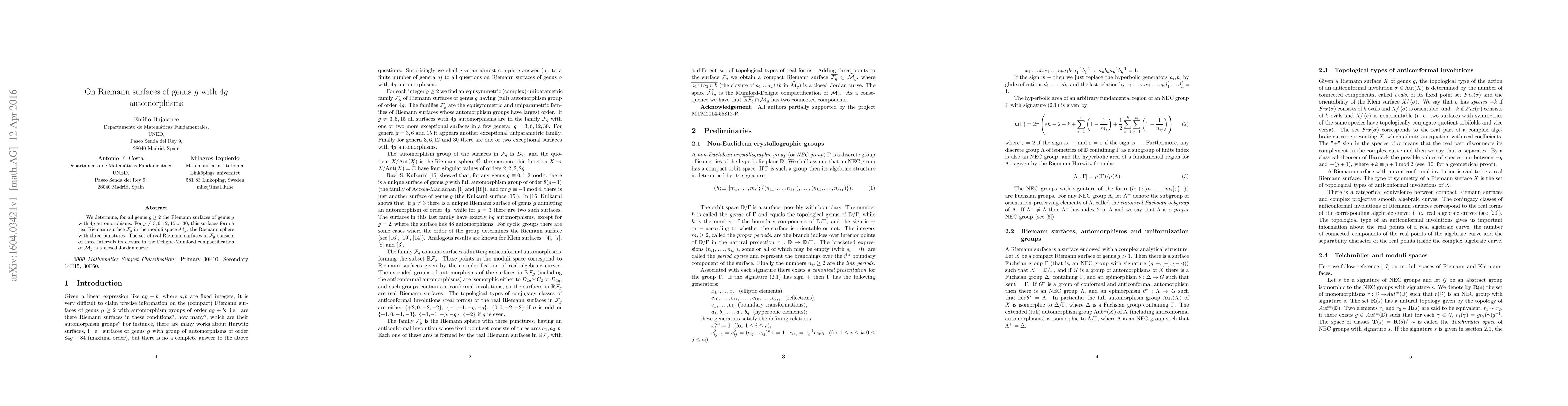 This paper identifies Riemann surfaces of genus $g$ with $4g$ automorphisms for $g \geq 2$. For $g$ not equal to 3, 6, 12, 15, or 30, these surfaces form a Riemann sphere with three punctures in the moduli space, with their closure forming a closed Jordan curve in the Deligne-Mumford compactification.