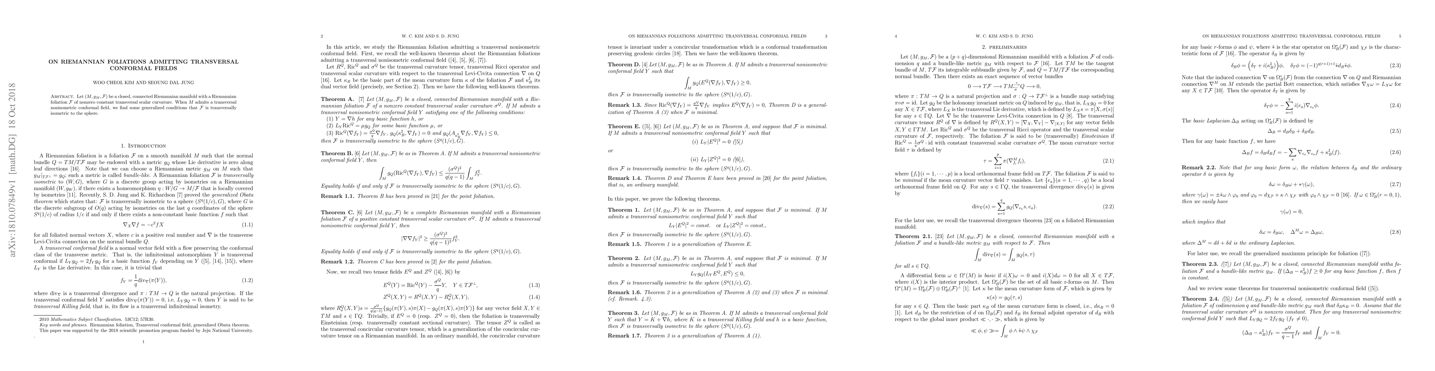 Let $(M,g_M,\mathcal F)$ be a closed, connected Riemannian manifold with a Riemannian foliation $\mathcal F$ of nonzero constant transversal scalar curvature. When $M$ admits a transversal nonisometric conformal field, we find some generalized conditions that $\mathcal F$ is transversally isometric to the sphere.