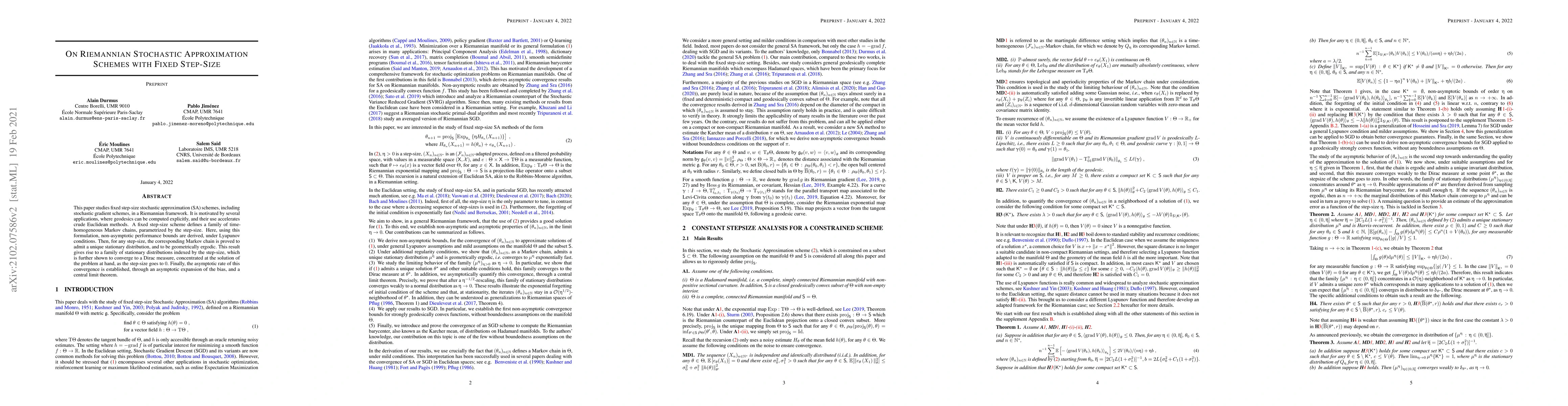 This paper explores fixed step-size stochastic approximation schemes within a Riemannian framework, deriving non-asymptotic performance bounds and proving the existence of a unique stationary distribution for each step-size, which converges to a Dirac measure at the solution as the step-size approaches zero.