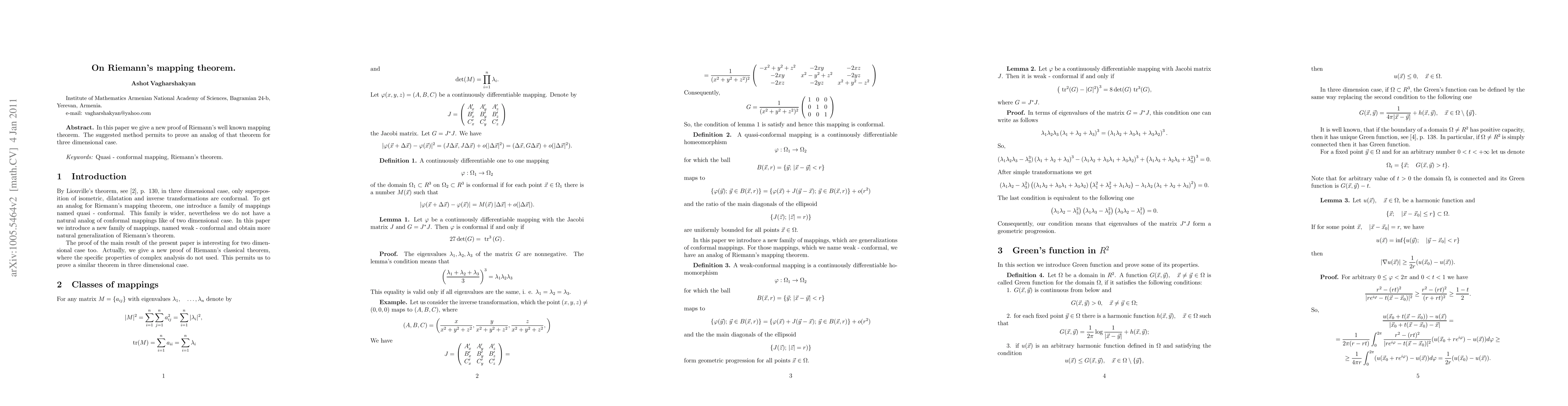 Summary: This paper presents a novel proof of Riemann's mapping theorem and extends its application to an analogous three-dimensional case.