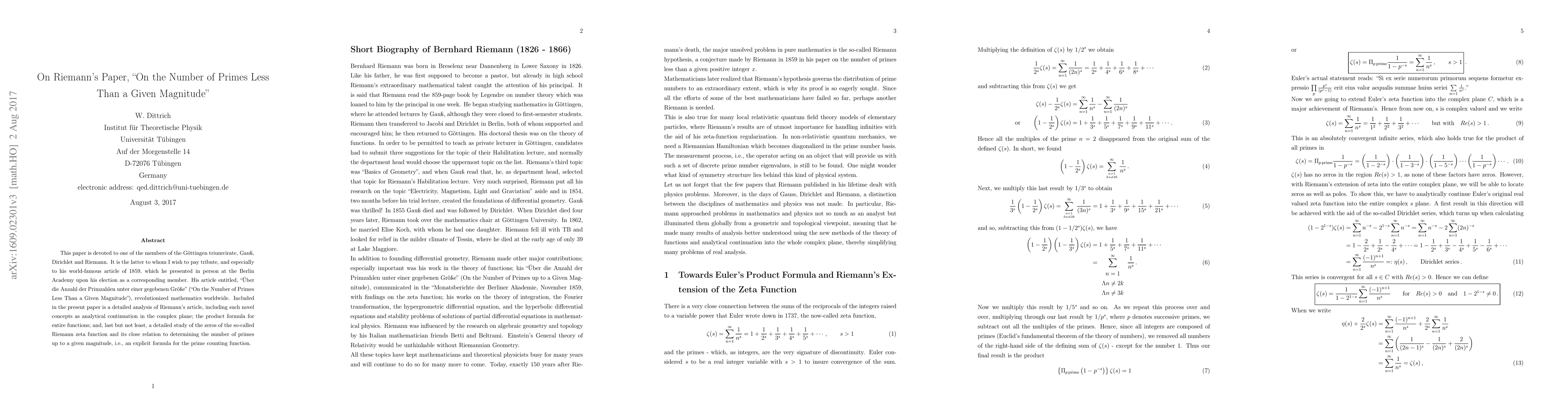 This paper is devoted to one of the members of the G\"ottingen triumvirate, Gau{\ss}, Dirichlet and Riemann. It is the latter to whom I wish to pay tribute, and especially to his world-famous article of 1859, which he presented in person at the Berlin Academy upon his election as a corresponding member. His article, entitled, "Uber die Anzahl der Primzahlen unter einer gegebenen Gr\"o{\ss}e" ("On the Number of Primes Less Than a Given Magnitude"), revolutionized mathematics worldwide. Included in the present paper is a detailed analysis of Riemann's article, including such novel concepts as analytical continuation in the complex plane; the product formula for entire functions; and, last but not least, a detailed study of the zeros of the so-called Riemann zeta function and its close relation to determining the number of primes up to a given magnitude, i.e., an explicit formula for the prime counting function.