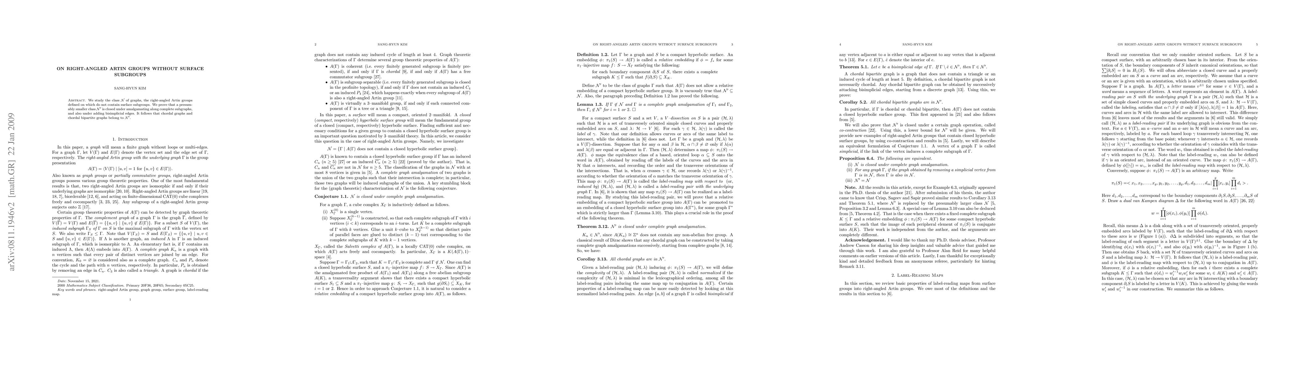 Summary: The paper investigates right-angled Artin groups derived from specific graph classes that lack surface subgroups, proving that a subclass N' remains closed under amalgamations and edge additions, which includes chordal and chordal bipartite graphs.