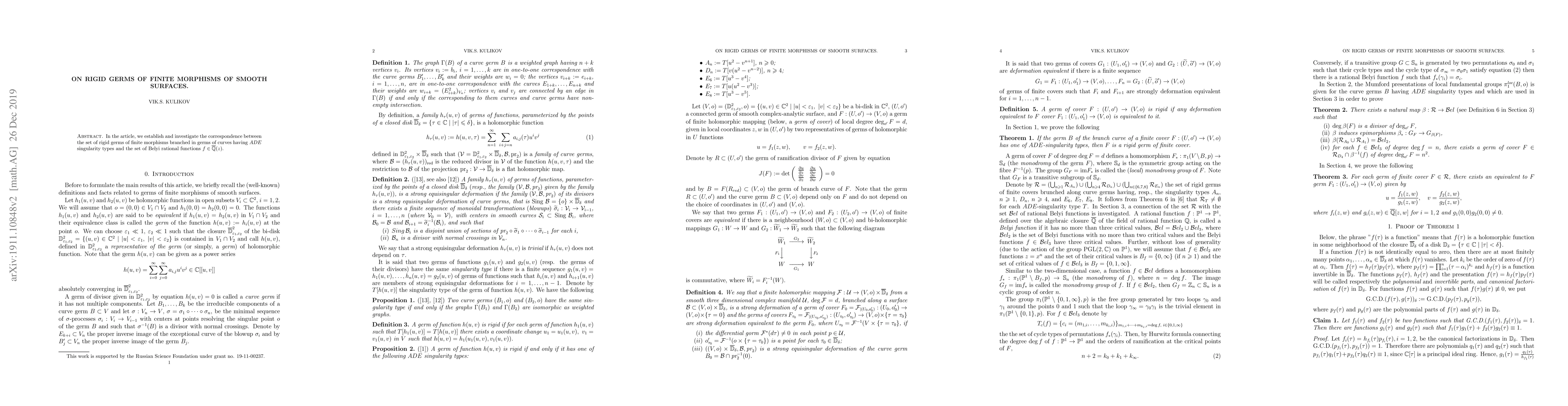 This paper proves that a finite morphism of smooth surfaces is rigid if its branch curve has an $ADE$-type singularity and establishes a correspondence between rigid germs and Belyi rational functions over algebraic numbers.