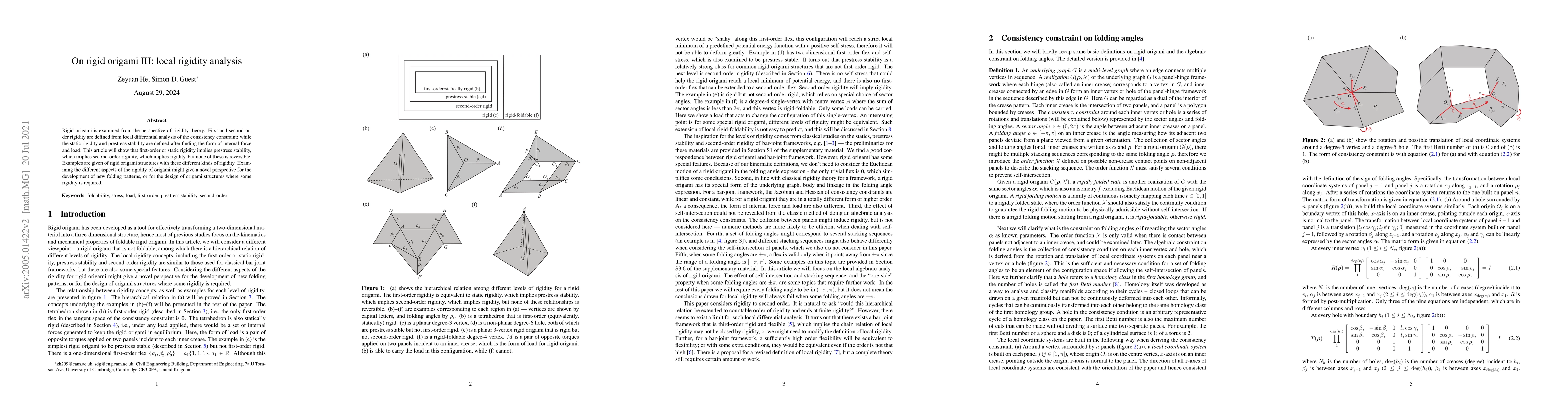 This paper explores various forms of rigidity in origami through differential analysis, establishing that first-order rigidity implies prestress stability, which in turn implies second-order rigidity, though none of these implications are reversible. It provides examples of rigid origami structures to illustrate these different types of rigidity.