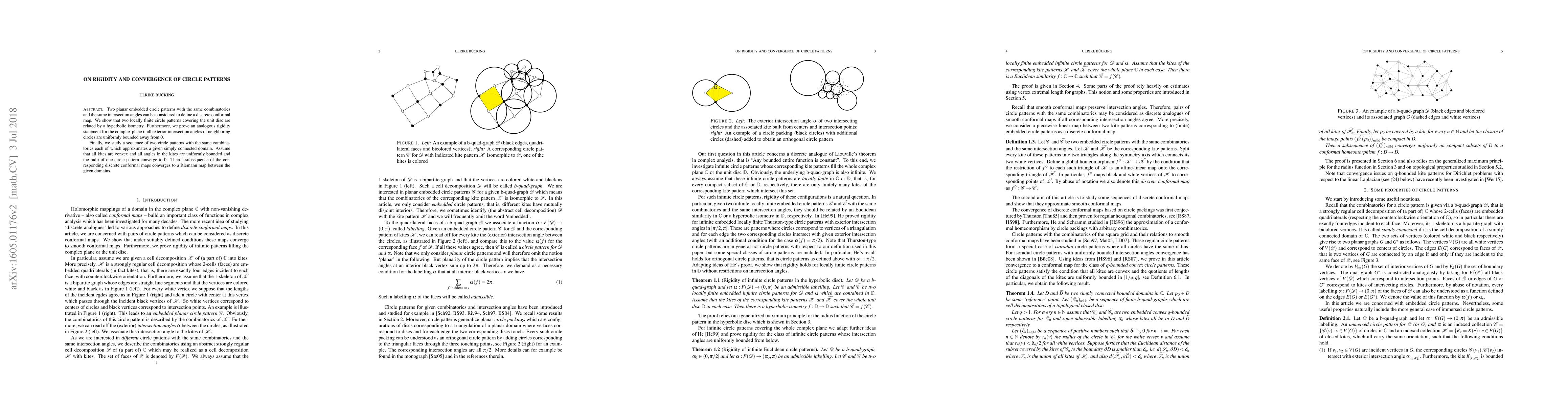 This paper demonstrates the rigidity of circle patterns with identical combinatorics and intersection angles, proving they are related by a hyperbolic isometry. It also establishes a convergence result for sequences of circle patterns approximating given domains, showing that under certain conditions, a subsequence of discrete conformal maps converges to a Riemann map.