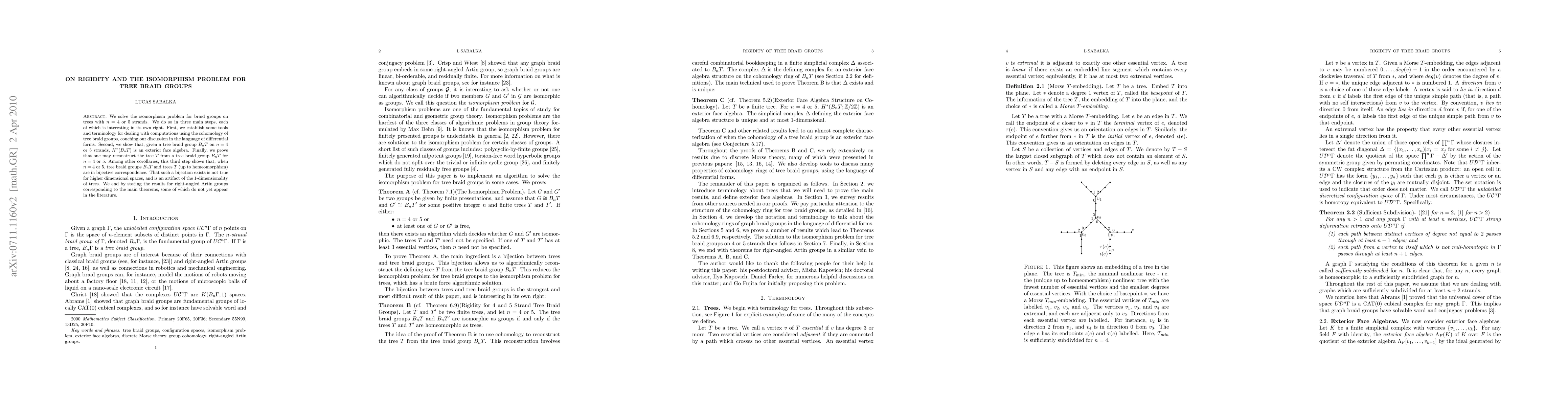 We solve the isomorphism problem for braid groups on trees with $n = 4$ or 5 strands. We do so in three main steps, each of which is interesting in its own right. First, we establish some tools and terminology for dealing with computations using the cohomology of tree braid groups, couching our discussion in the language of differential forms. Second, we show that, given a tree braid group $B_nT$ on $n = 4$ or 5 strands, $H^*(B_nT)$ is an exterior face algebra. Finally, we prove that one may reconstruct the tree $T$ from a tree braid group $B_nT$ for $n = 4$ or 5. Among other corollaries, this third step shows that, when $n = 4$ or 5, tree braid groups $B_nT$ and trees $T$ (up to homeomorphism) are in bijective correspondence. That such a bijection exists is not true for higher dimensional spaces, and is an artifact of the 1-dimensionality of trees. We end by stating the results for right-angled Artin groups corresponding to the main theorems, some of which do not yet appear in the literature.