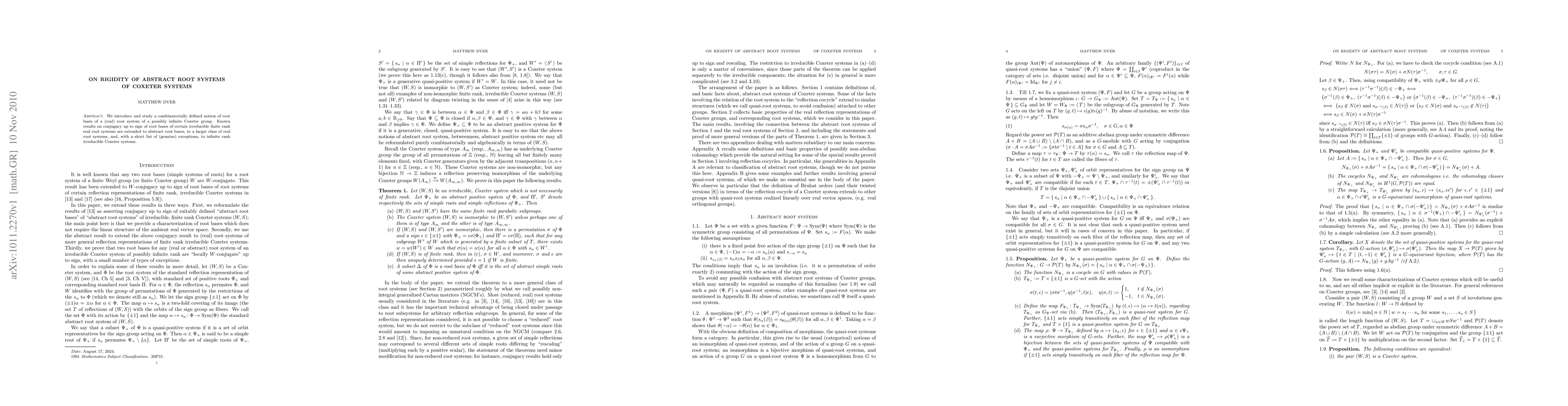 This paper introduces a combinatorial notion of root basis for abstract root systems of Coxeter groups, extending known results on conjugacy up to sign to a broader class of real root systems, including infinite rank irreducible Coxeter systems with few exceptions.