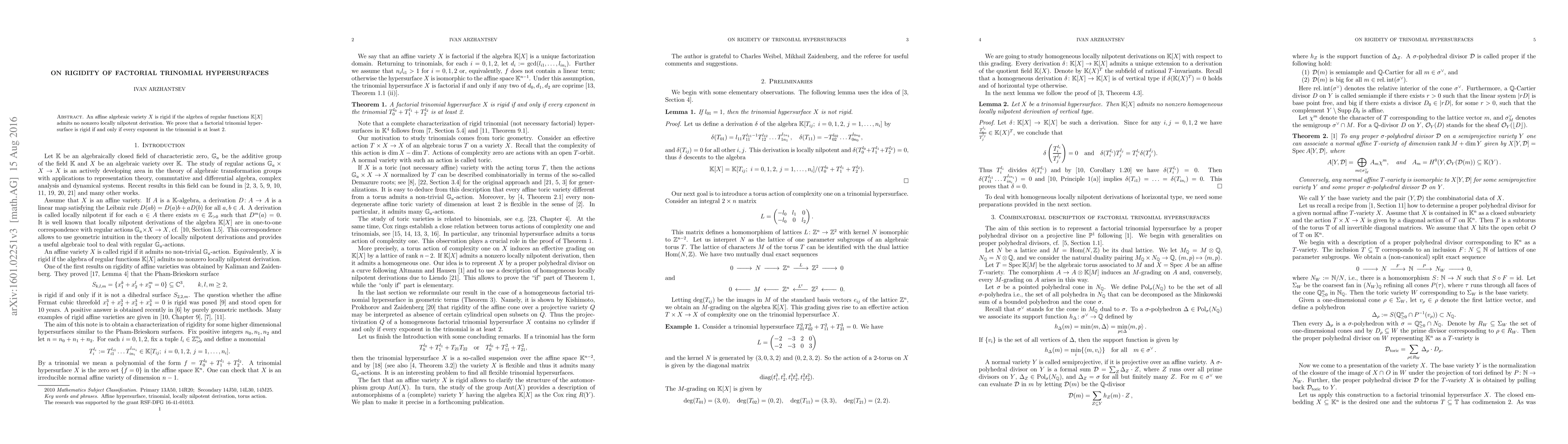 Summary: This paper proves that an affine algebraic variety defined by a factorial trinomial is rigid if and only if each exponent in the trinomial is at least 2, establishing a condition for the absence of nonzero locally nilpotent derivations.