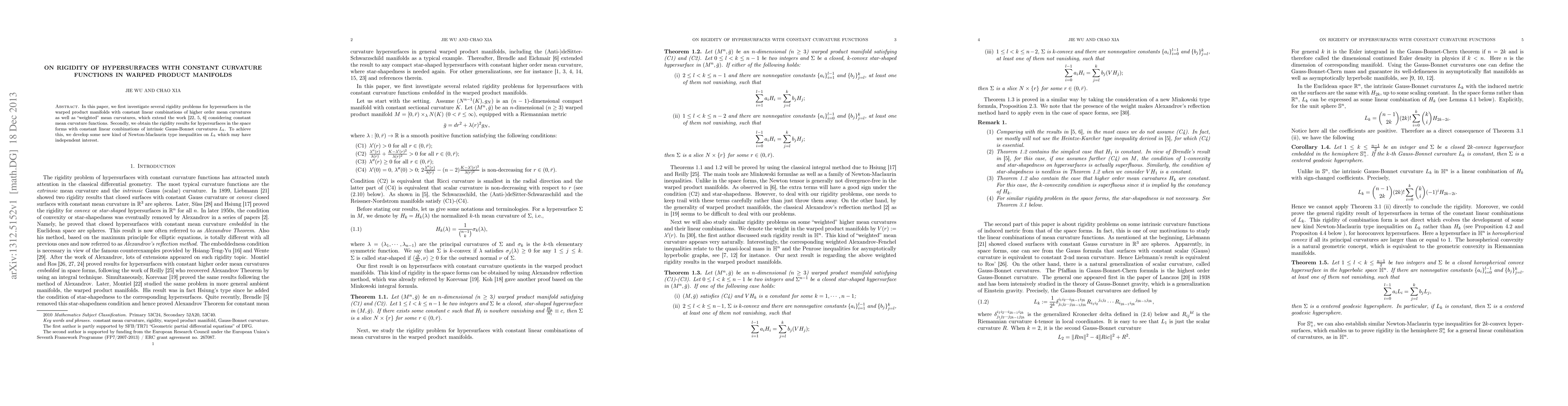 This paper explores rigidity problems for hypersurfaces in warped product manifolds with constant curvature functions, extending previous work on constant mean curvature. It also establishes rigidity results for hypersurfaces in space forms with constant intrinsic Gauss-Bonnet curvatures, developing new Newton-Maclaurin type inequalities in the process.