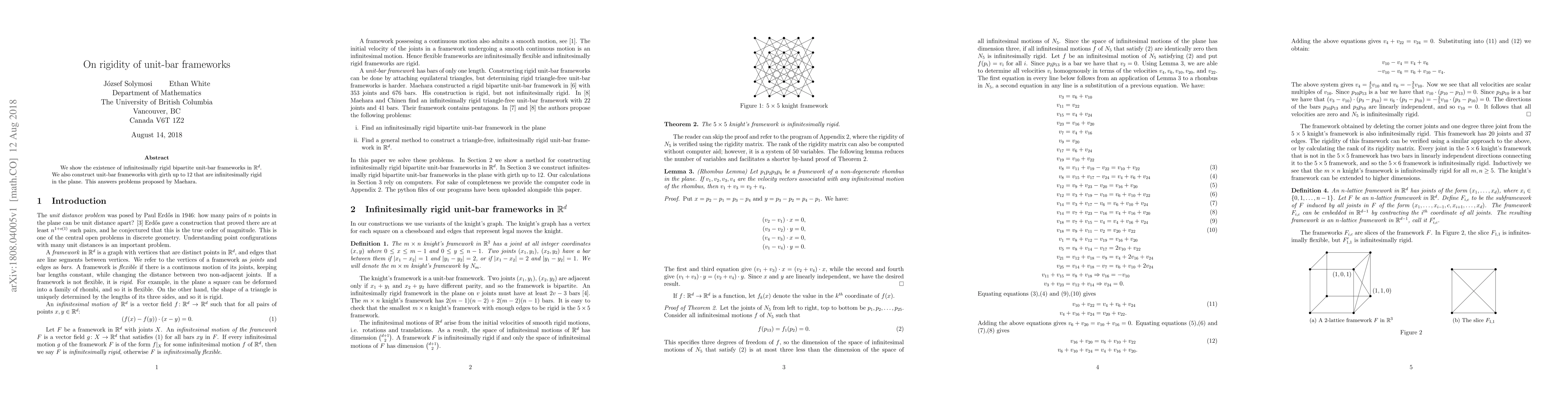 Summary: This paper demonstrates the existence of infinitesimally rigid bipartite unit-bar frameworks in $\mathbb{R}^d$ and constructs frameworks with girth up to 12 that are infinitesimally rigid in the plane, resolving Maehara's proposed problems.