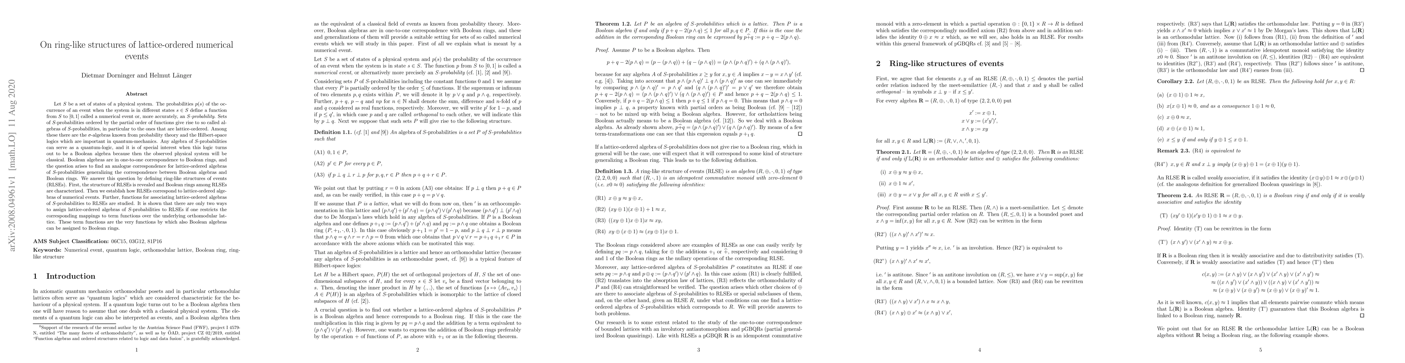 Let S be a set of states of a physical system. The probabilities p(s) of the occurrence of an event when the system is in different states s of S define a function from S to [0,1] called a numerical event or, more accurately, an S-probability. Sets of S-probabilities ordered by the partial order of functions give rise to so called algebras of S-probabilities, in particular to the ones that are lattice-ordered. Among these there are the sigma-algebras known from probability theory and the Hilbert-space logics which are important in quantum-mechanics. Any algebra of S-probabilities can serve as a quantum-logic, and it is of special interest when this logic turns out to be a Boolean algebra because then the observed physical system will be classical. Boolean algebras are in one-to-one correspondence to Boolean rings, and the question arises to find an analogue correspondence for lattice-ordered algebras of S-probabilities generalizing the correspondence between Boolean algebras and Boolean rings. We answer this question by defining ring-like structures of events (RLSEs). First, the structure of RLSEs is revealed and Boolean rings among RLSEs are characterized. Then we establish how RLSEs correspond to lattice-ordered algebras of numerical events. Further, functions for associating lattice-ordered algebras of S-probabilities to RLSEs are studied. It is shown that there are only two ways to assign lattice-ordered algebras of S-probabilities to RLSEs if one restricts the corresponding mappings to term functions over the underlying orthomodular lattice. These term functions are the very functions by which also Boolean algebras can be assigned to Boolean rings.