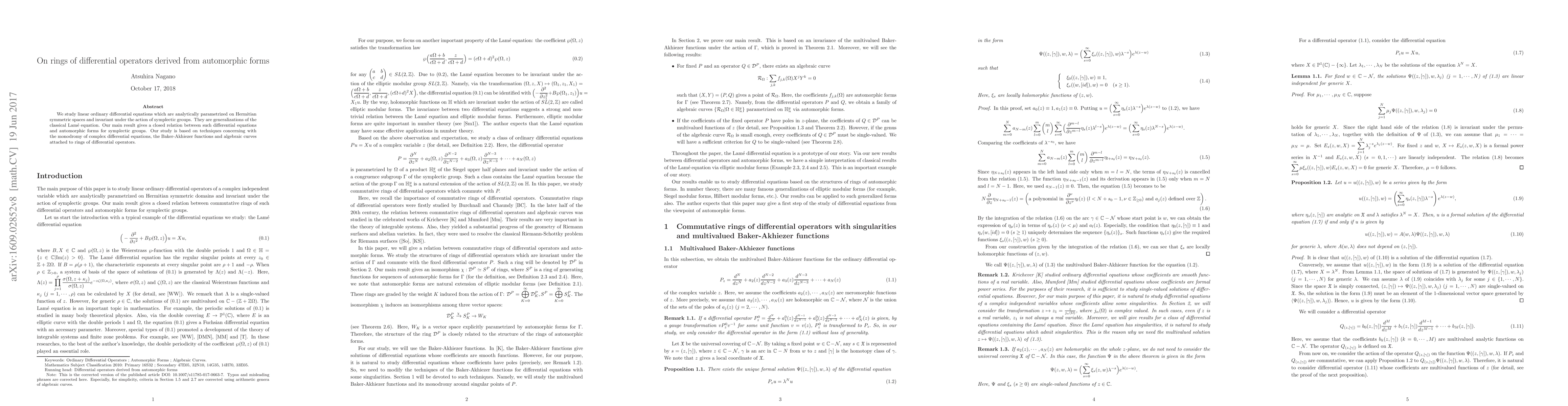This paper investigates linear ordinary differential equations invariant under symplectic group actions on Hermitian symmetric spaces, deriving a closed relation between these equations and automorphic forms for symplectic groups using techniques from monodromy, Baker-Akhiezer functions, and algebraic curves.