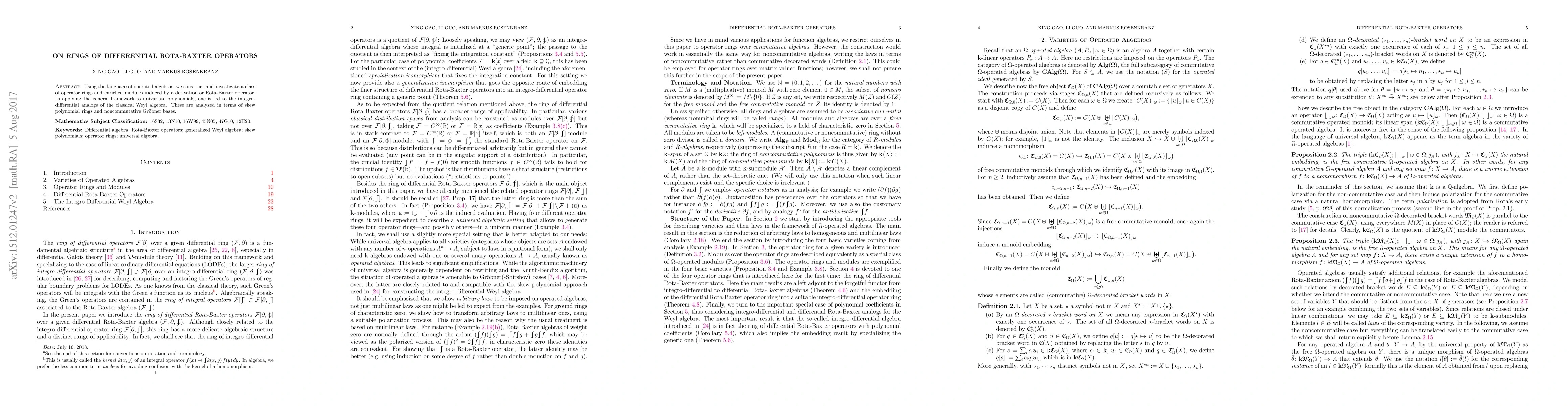 Using the language of operated algebras, we construct and investigate a class of operator rings and enriched modules induced by a derivation or Rota-Baxter operator. In applying the general framework to univariate polynomials, one is led to the integro-differential analogs of the classical Weyl algebra. These are analyzed in terms of skew polynomial rings and noncommutative Groebner bases.