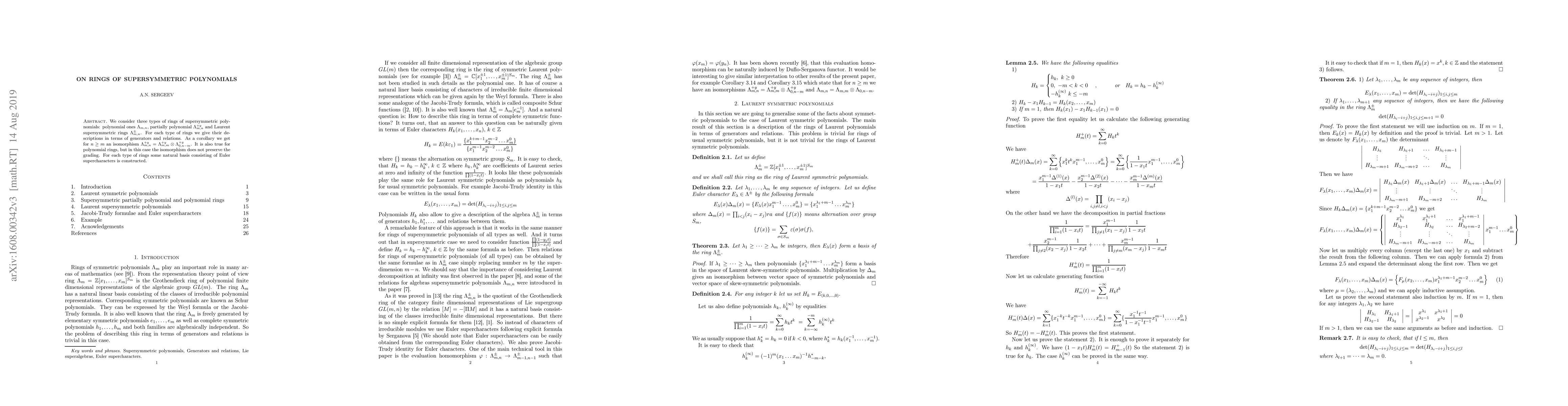 We consider three types of rings of supersymmetric polynomials: polynomial ones $\Lambda_{m,n}$, partially polynomial $\Lambda_{m,n}^{+y}$ and Laurent supersymmetric rings $\Lambda_{m,n}^{\pm}$. For each type of rings we give their descriptions in terms of generators and relations. As a corollary we get for $n\ge m$ an isomorphism $\Lambda_{m,n}^{+y}=\Lambda_{m,m}^{+y}\otimes\Lambda^{+y}_{0,n-m}$. We also have the same sort of isomorphism for polynomial rings, but in this case the isomorphism does not preserve the grading. For each type of rings we also construct some natural basis consisting of Euler characters.