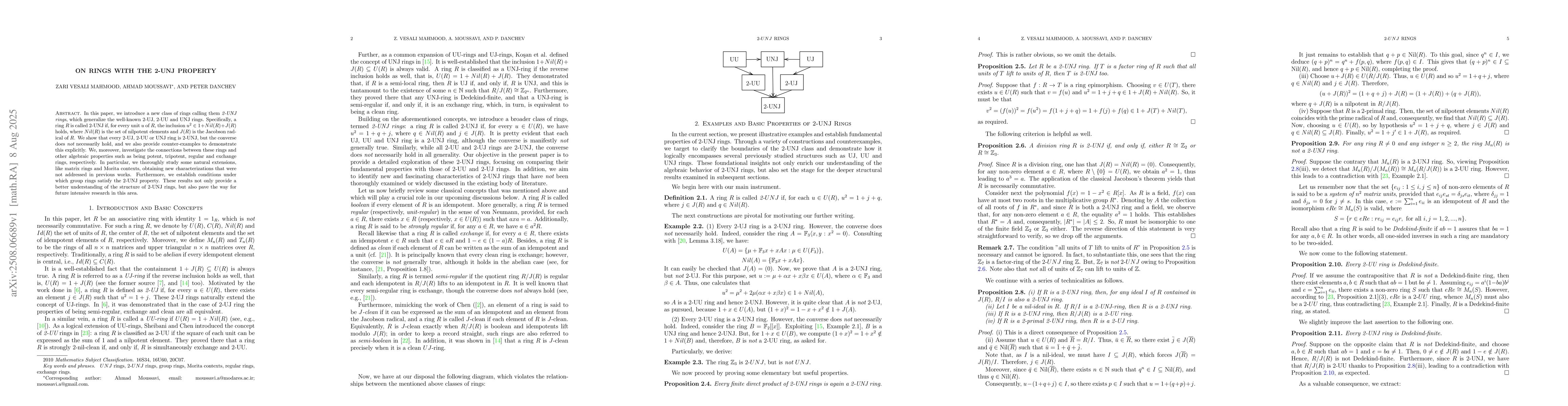 In this paper, we introduce a new class of rings calling them {\it 2-UNJ rings}, which generalize the well-known 2-UJ, 2-UU and UNJ rings. Specifically, a ring $R$ is called 2-UNJ if, for every unit $u$ of $R$, the inclusion $u^2 \in 1 + Nil(R) + J(R)$ holds, where $Nil(R)$ is the set of nilpotent elements and $J(R)$ is the Jacobson radical of $R$. We show that every 2-UJ, 2-UU or UNJ ring is 2-UNJ, but the converse does {\it not} necessarily hold, and we also provide counter-examples to demonstrate this explicitly. We, moreover, investigate the connections between these rings and other algebraic properties such as being potent, tripotent, regular and exchange rings, respectively. In particular, we thoroughly study some natural extensions, like matrix rings and Morita contexts, obtaining new characterizations that were not addressed in previous works. Furthermore, we establish conditions under which group rings satisfy the 2-UNJ property. These results not only provide a better understanding of the structure of 2-UNJ rings, but also pave the way for future intensive research in this area.
