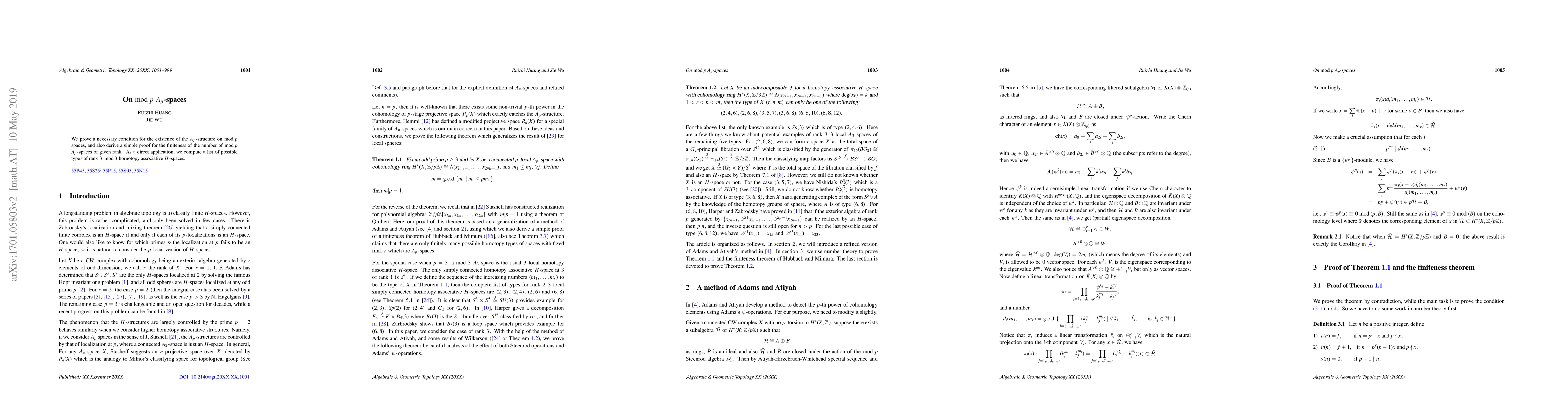 This paper establishes a necessary condition for $A_p$-structures on ${\rm mod}~p$ spaces and provides a proof for the finite number of such structures of a given rank, specifically computing types for rank 3 ${\rm mod}~3$ homotopy associative $H$-spaces.