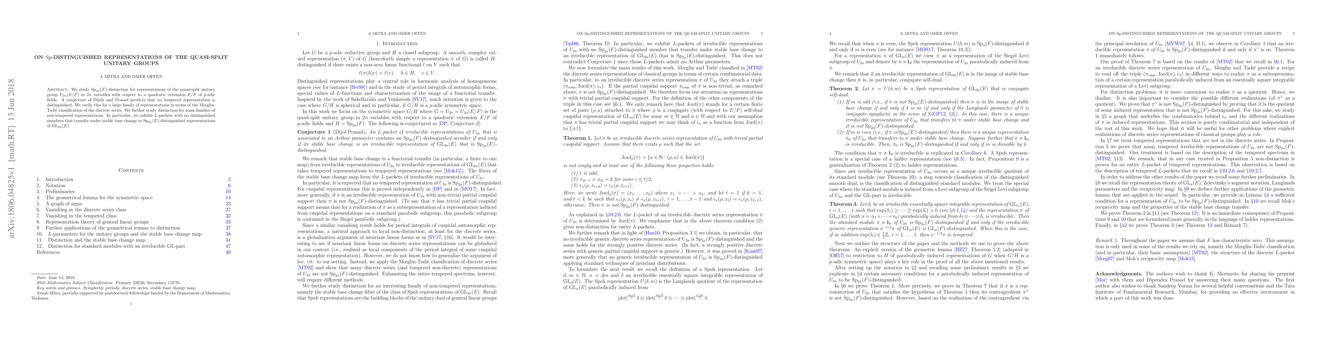 We study ${\rm Sp}_{2n}(F)$-distinction for representations of the quasi-split unitary group $U_{2n}(E/F)$ in $2n$ variables with respect to a quadratic extension $E/F$ of $p$-adic fields. A conjecture of Dijols and Prasad predicts that no tempered representation is distinguished. We verify this for a large family of representations in terms of the Moeglin-Tadic classification of the discrete series. We further study distinction for some families of non-tempered representations. In particular, we exhibit $L$-packets with no distinguished members that transfer under stable base change to ${\rm Sp}_{2n}(E)$-distinguished representations of ${\rm GL}_{2n}(E)$.