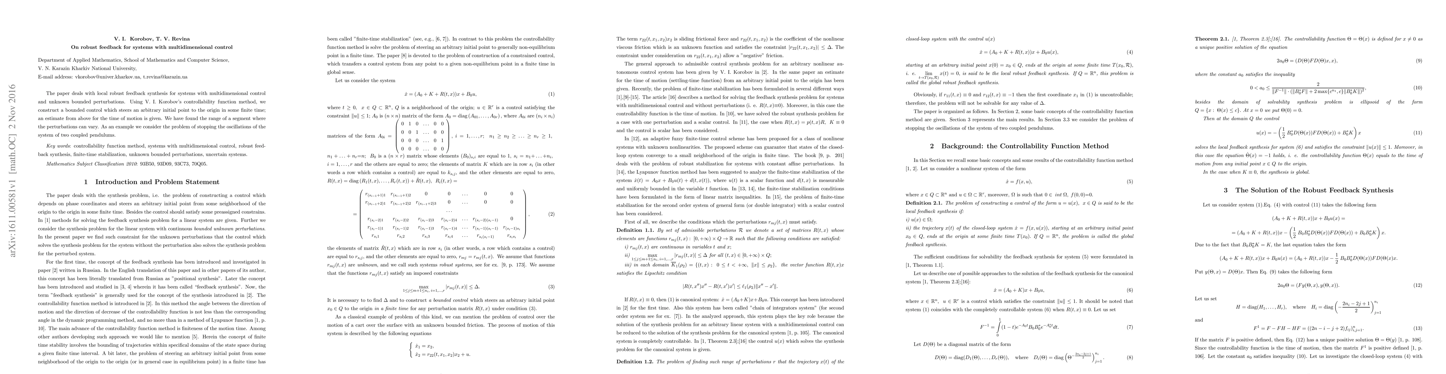 The paper deals with local robust feedback synthesis for systems with multidimensional control and unknown bounded perturbations. Using V.~I.~Korobov's controllability function method, we construct a bounded control which steers an arbitrary initial point to the origin in some finite time; an estimate from above for the time of motion is given. We have found the range of a segment where the perturbations can vary. As an example we consider the problem of stopping the oscillations of the system of two coupled pendulums.