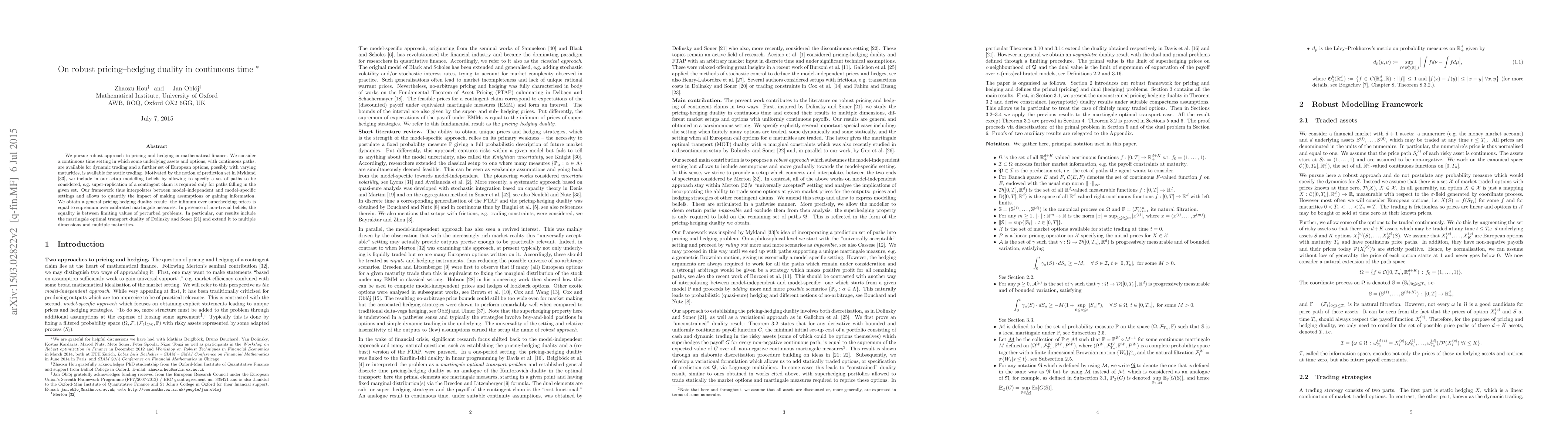 We pursue robust approach to pricing and hedging in mathematical finance. We consider a continuous time setting in which some underlying assets and options, with continuous paths, are available for dynamic trading and a further set of European options, possibly with varying maturities, is available for static trading. Motivated by the notion of prediction set in Mykland (2003), we include in our setup modelling beliefs by allowing to specify a set of paths to be considered, e.g. super-replication of a contingent claim is required only for paths falling in the given set. Our framework thus interpolates between model-independent and model-specific settings and allows to quantify the impact of making assumptions or gaining information. We obtain a general pricing-hedging duality result: the infimum over superhedging prices is equal to supremum over calibrated martingale measures. In presence of non-trivial beliefs, the equality is between limiting values of perturbed problems. In particular, our results include the martingale optimal transport duality of Dolinsky and Soner (2013) and extend it to multiple dimensions and multiple maturities.
