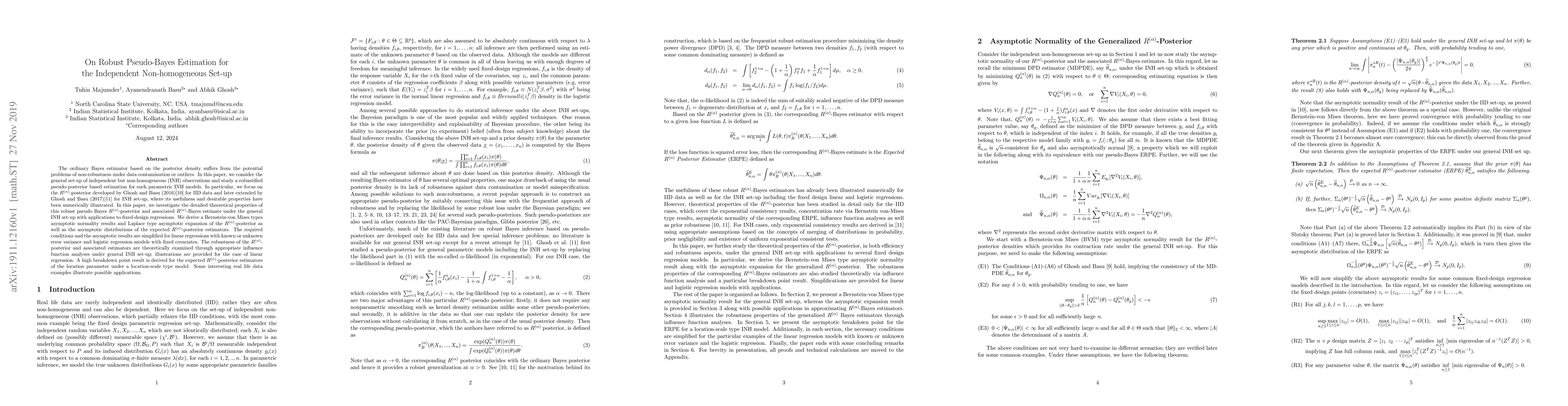 This paper investigates robust pseudo-Bayes estimation for independent non-homogeneous (INH) observations, focusing on the $R^{(\alpha)}$-posterior. It derives theoretical properties, asymptotic normality, and influence function analyses, and applies these to linear and logistic regression models, demonstrating robustness and high breakdown points.
