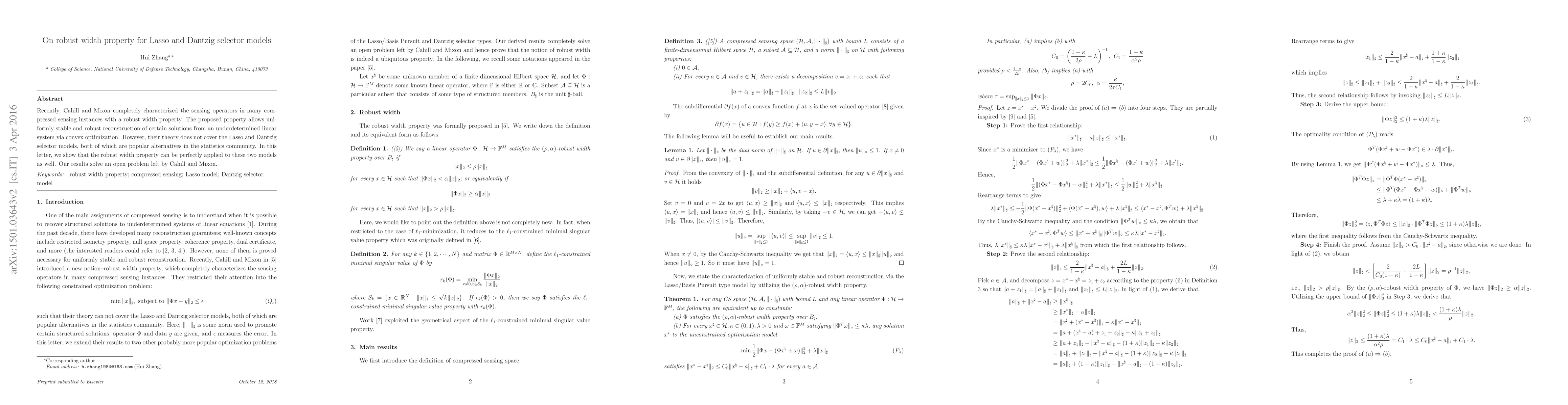 Recently, Cahill and Mixon completely characterized the sensing operators in many compressed sensing instances with a robust width property. The proposed property allows uniformly stable and robust reconstruction of certain solutions from an underdetermined linear system via convex optimization. However, their theory does not cover the Lasso and Dantzig selector models, both of which are popular alternatives in the statistics community. In this letter, we show that the robust width property can be perfectly applied to these two models as well. Our results solve an open problem left by Cahill and Mixon.