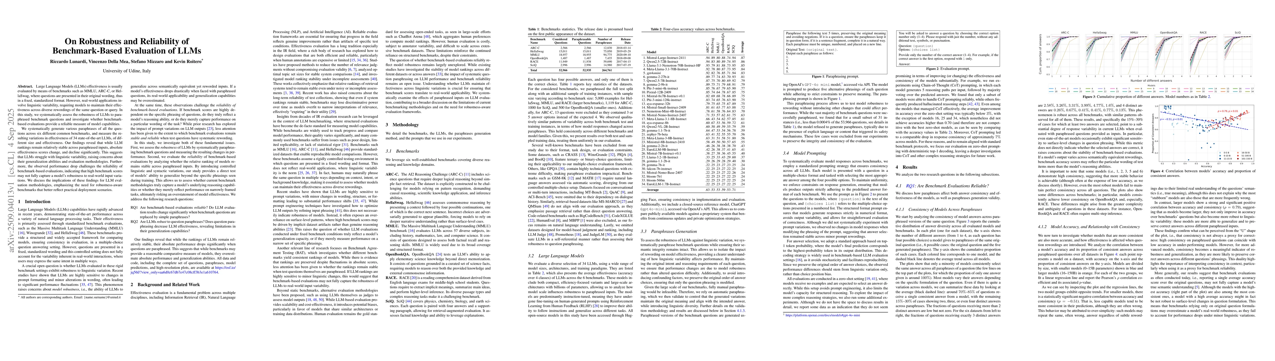 Large Language Models (LLMs) effectiveness is usually evaluated by means of benchmarks such as MMLU, ARC-C, or HellaSwag, where questions are presented in their original wording, thus in a fixed, standardized format. However, real-world applications involve linguistic variability, requiring models to maintain their effectiveness across diverse rewordings of the same question or query. In this study, we systematically assess the robustness of LLMs to paraphrased benchmark questions and investigate whether benchmark-based evaluations provide a reliable measure of model capabilities. We systematically generate various paraphrases of all the questions across six different common benchmarks, and measure the resulting variations in effectiveness of 34 state-of-the-art LLMs, of different size and effectiveness. Our findings reveal that while LLM rankings remain relatively stable across paraphrased inputs, absolute effectiveness scores change, and decline significantly. This suggests that LLMs struggle with linguistic variability, raising concerns about their generalization abilities and evaluation methodologies. Furthermore, the observed performance drop challenges the reliability of benchmark-based evaluations, indicating that high benchmark scores may not fully capture a model's robustness to real-world input variations. We discuss the implications of these findings for LLM evaluation methodologies, emphasizing the need for robustness-aware benchmarks that better reflect practical deployment scenarios.