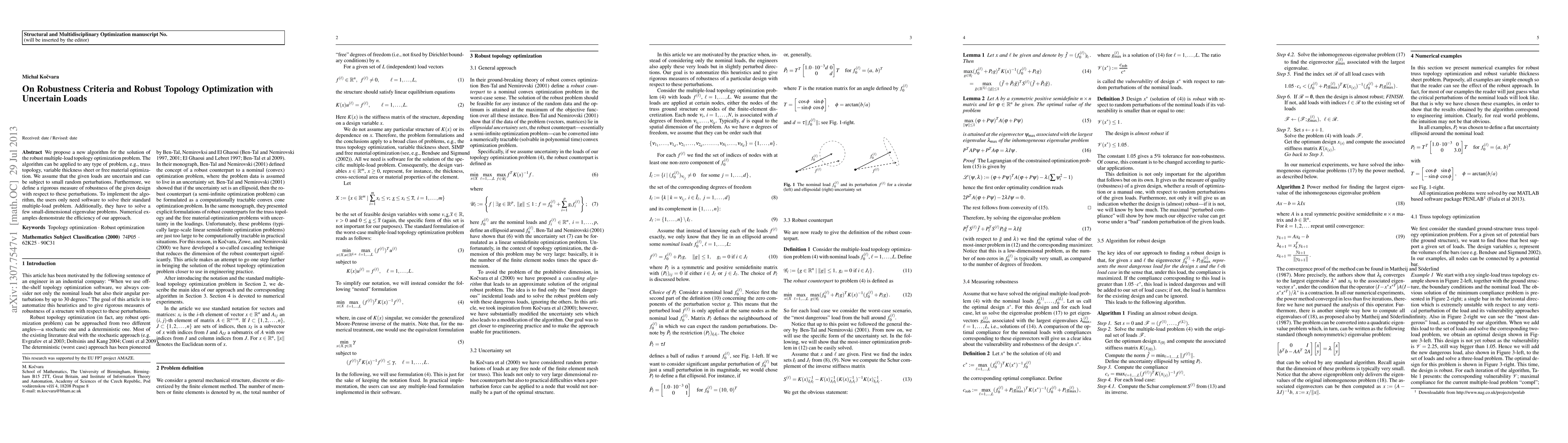 This paper introduces a new algorithm for robust topology optimization under uncertain loads, applicable to various structural designs. It defines a robust measure of design stability against random load perturbations and demonstrates its efficiency through numerical examples.