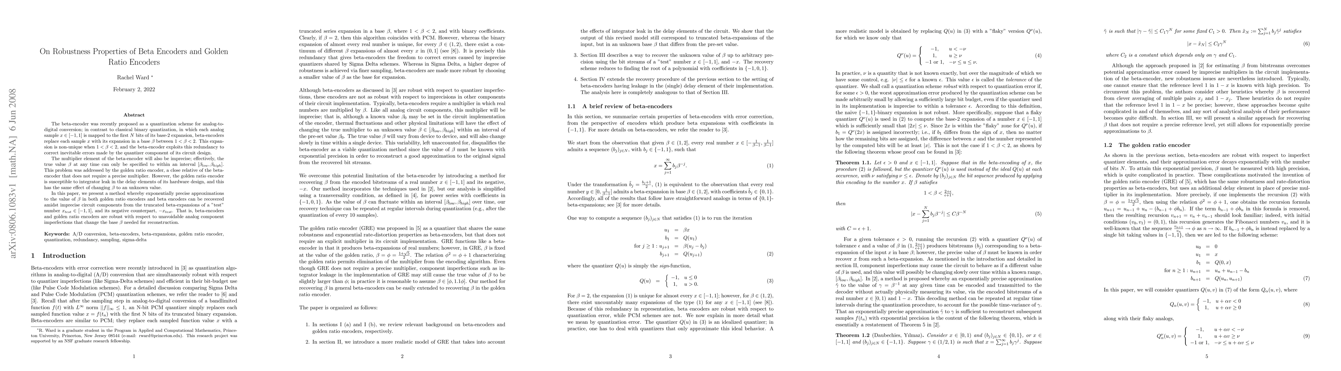 This paper investigates the robustness of beta-encoders and golden ratio encoders against component imprecisions in analog-to-digital conversion. It proposes a method to recover the value of beta from truncated expansions, ensuring the encoders' performance despite hardware imperfections.