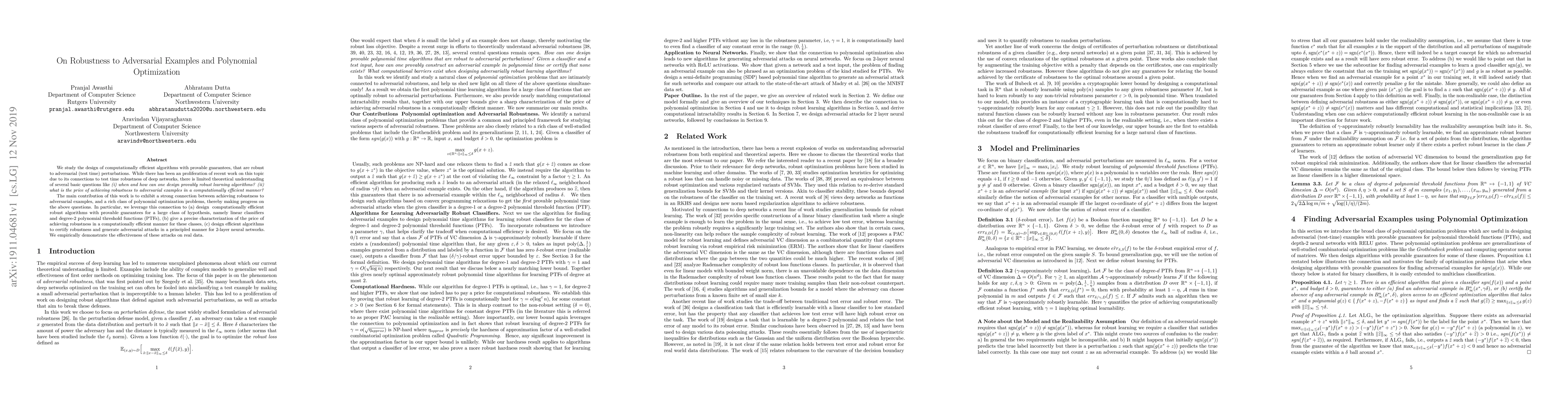 This paper explores the design of efficient algorithms with provable guarantees for robustness against adversarial perturbations, linking this problem to polynomial optimization. It develops robust algorithms for linear classifiers and degree-2 polynomial threshold functions, characterizes the computational cost of achieving such robustness, and designs efficient certification and attack algorithms for 2-layer neural networks, demonstrating practical effectiveness on real data.