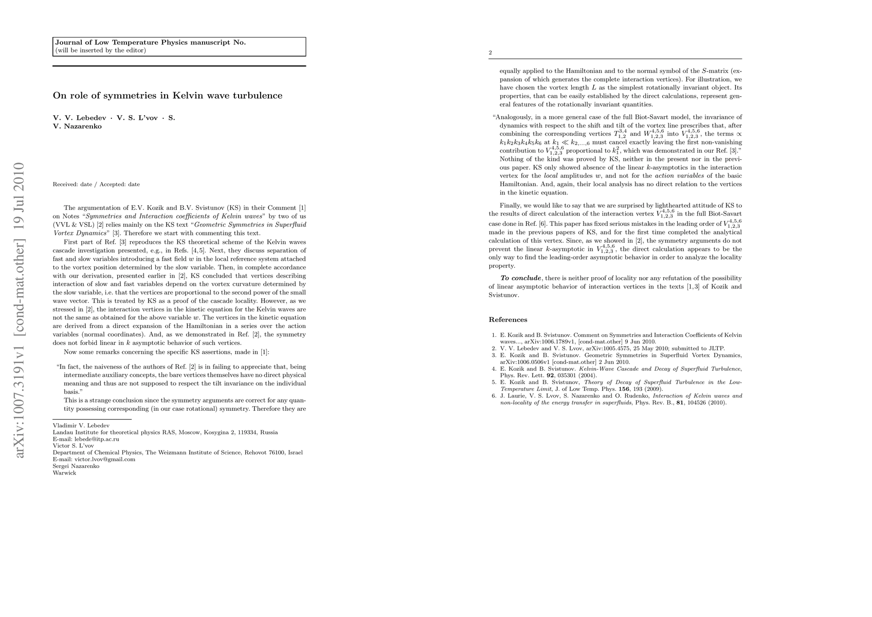 E.V. Kozik and B.V. Svistunov (KS) paper "Symmetries and Interaction Coefficients of Kelvin waves", arXiv:1006.1789v1, [cond-mat.other] 9 Jun 2010, contains a comment on paper "Symmetries and Interaction coefficients of Kelvin waves", V. V. Lebedev and V. S. L'vov, arXiv:1005.4575, 25 May 2010. It relies mainly on the KS text "Geometric Symmetries in Superfluid Vortex Dynamics}", arXiv:1006.0506v1 [cond-mat.other] 2 Jun 2010. The main claim of KS is that a symmetry argument prevents linear in wavenumber infrared asymptotics of the interaction vertex and thereby implies locality of the Kelvin wave spectrum previously obtained by these authors. In the present note we reply to their arguments. We conclude that there is neither proof of locality nor any refutation of the possibility of linear asymptotic behavior of interaction vertices in the texts of KS.