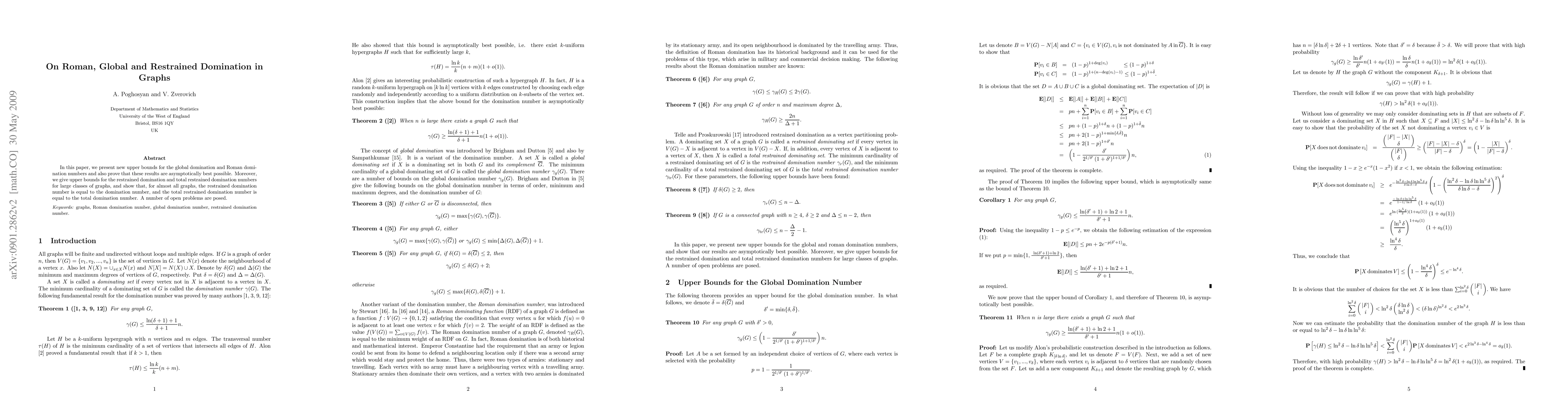 In this paper, we present new upper bounds for the global domination and Roman domination numbers and also prove that these results are asymptotically best possible. Moreover, we give upper bounds for the restrained domination and total restrained domination numbers for large classes of graphs, and show that, for almost all graphs, the restrained domination number is equal to the domination number, and the total restrained domination number is equal to the total domination number. A number of open problems are posed.