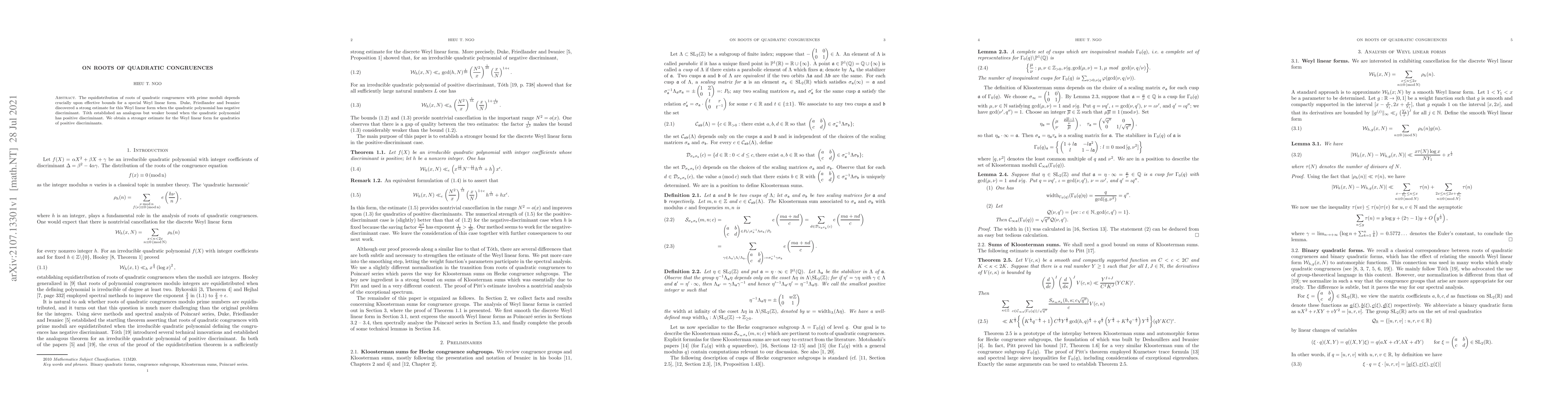 Summary: The paper improves the estimate for a Weyl linear form crucial to understanding the equidistribution of roots of quadratic congruences, specifically providing a stronger bound for quadratics with positive discriminants compared to prior work.