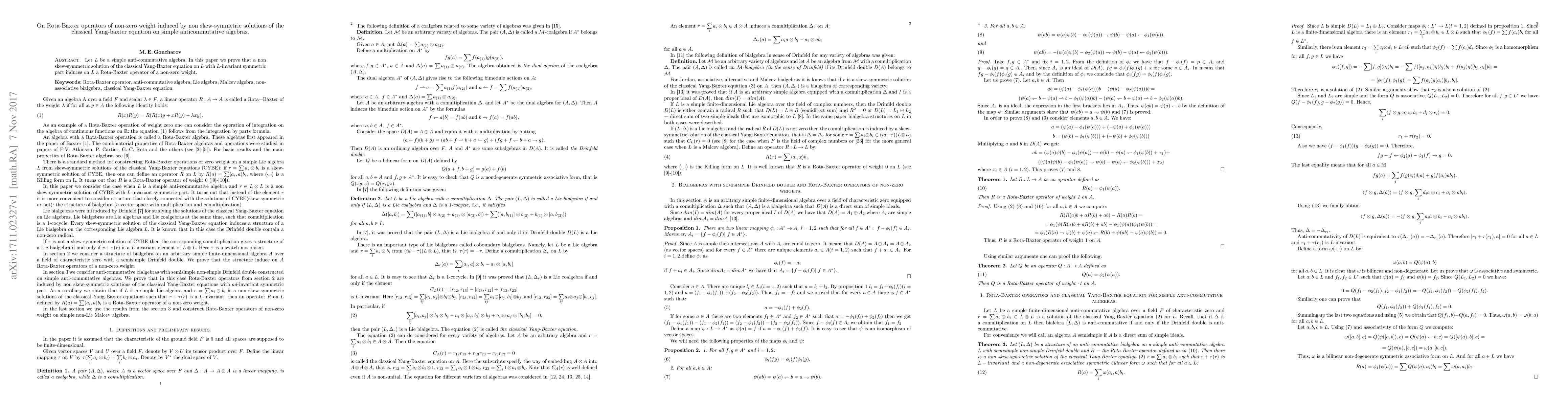 This paper demonstrates that a non-skew-symmetric solution to the classical Yang-Baxter equation on a simple anti-commutative algebra, with an invariant symmetric part, leads to a Rota-Baxter operator of non-zero weight on the algebra.