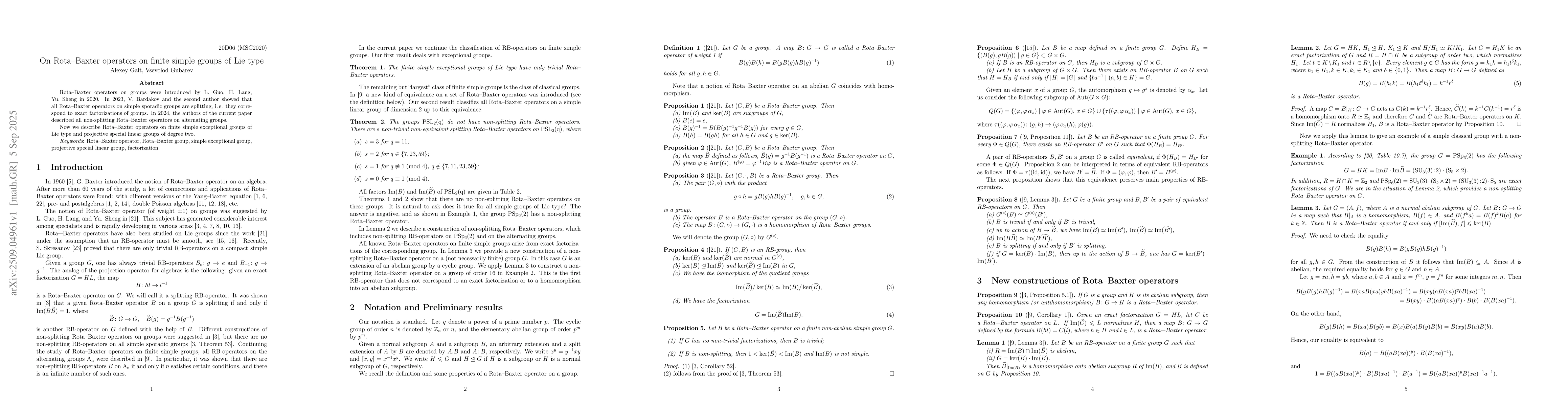 Rota--Baxter operators on groups were introduced by L. Guo, H. Lang, Yu. Sheng in 2020. In 2023, V. Bardakov and the second author showed that all Rota--Baxter operators on simple sporadic groups are splitting, i.\,e. they correspond to exact factorizations of groups. In 2024, the authors of the current paper described all non-splitting Rota--Baxter operators on alternating groups. Now we describe Rota--Baxter operators on finite simple exceptional groups of Lie type and projective special linear groups of degree two.
